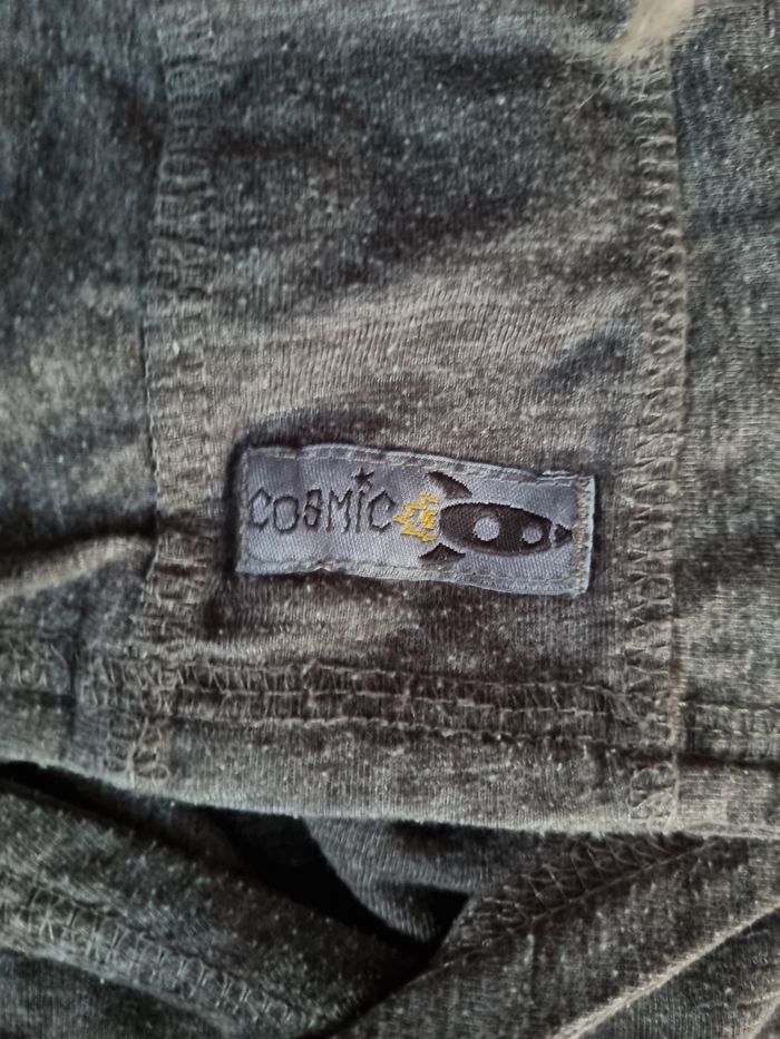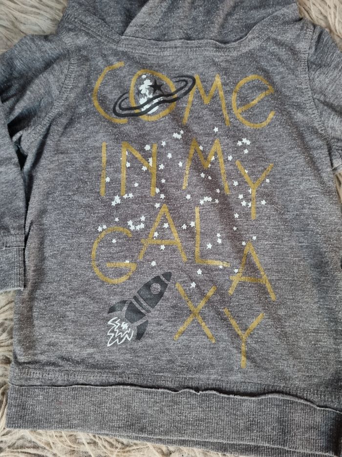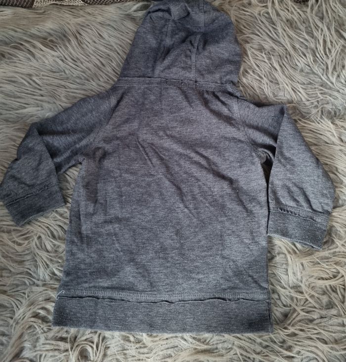 Pull à capuche avec écriture (légèrement craquelé), taille 24mois marque Kiabi.