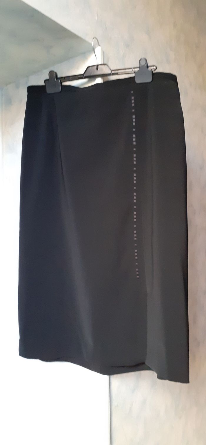 Vends une jupe droite en polyester, doublée, ceinture plate, fendue sur un côté, très bonne tenue, couleur noir, taille 48 ou petit 50. Longueur : 79 cm Largeur de la ceinture à plat : 45 cm Largeur au niveau des hanches : 57 cm.