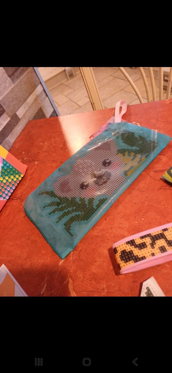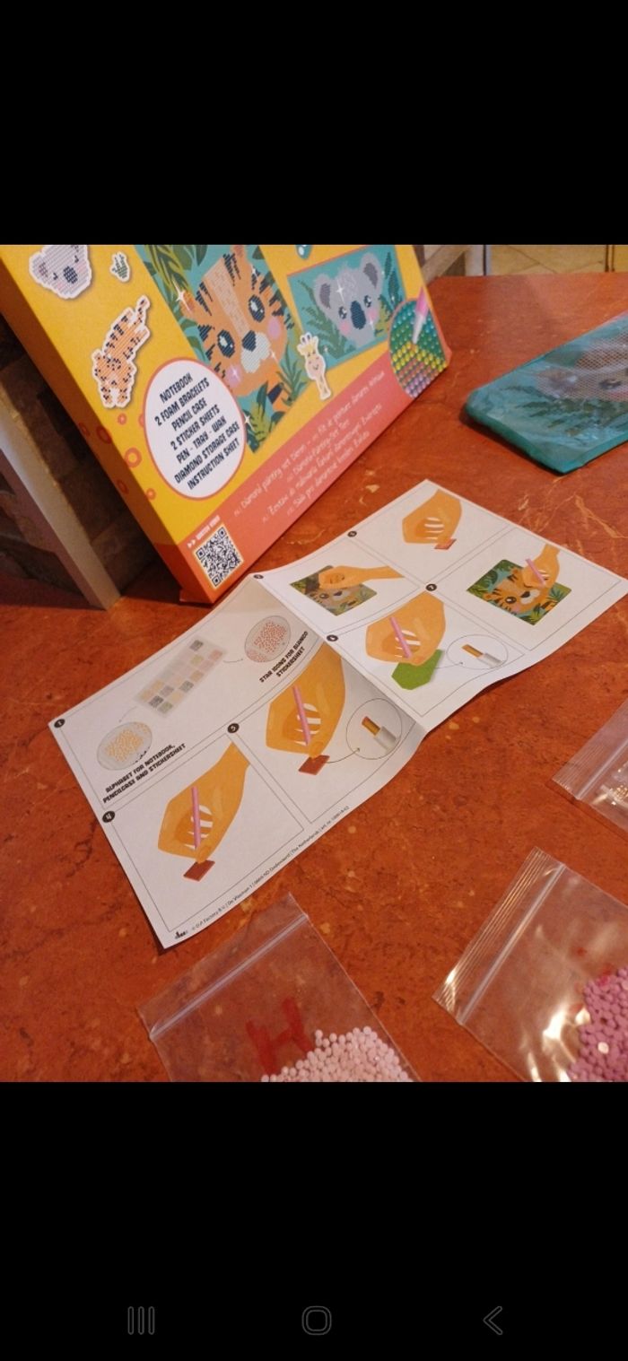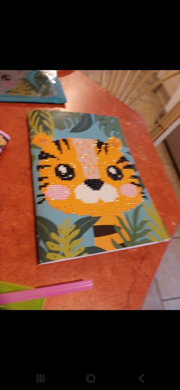 Kit comprenant évidemment les diamants, le récipient, le stylet et la colle ( déjà entamée) . Avec une trousse ( qui reste à faire ) , quelques stickers, un bracelet, et un bloc note qui a déjà été fait mais qui est vide .