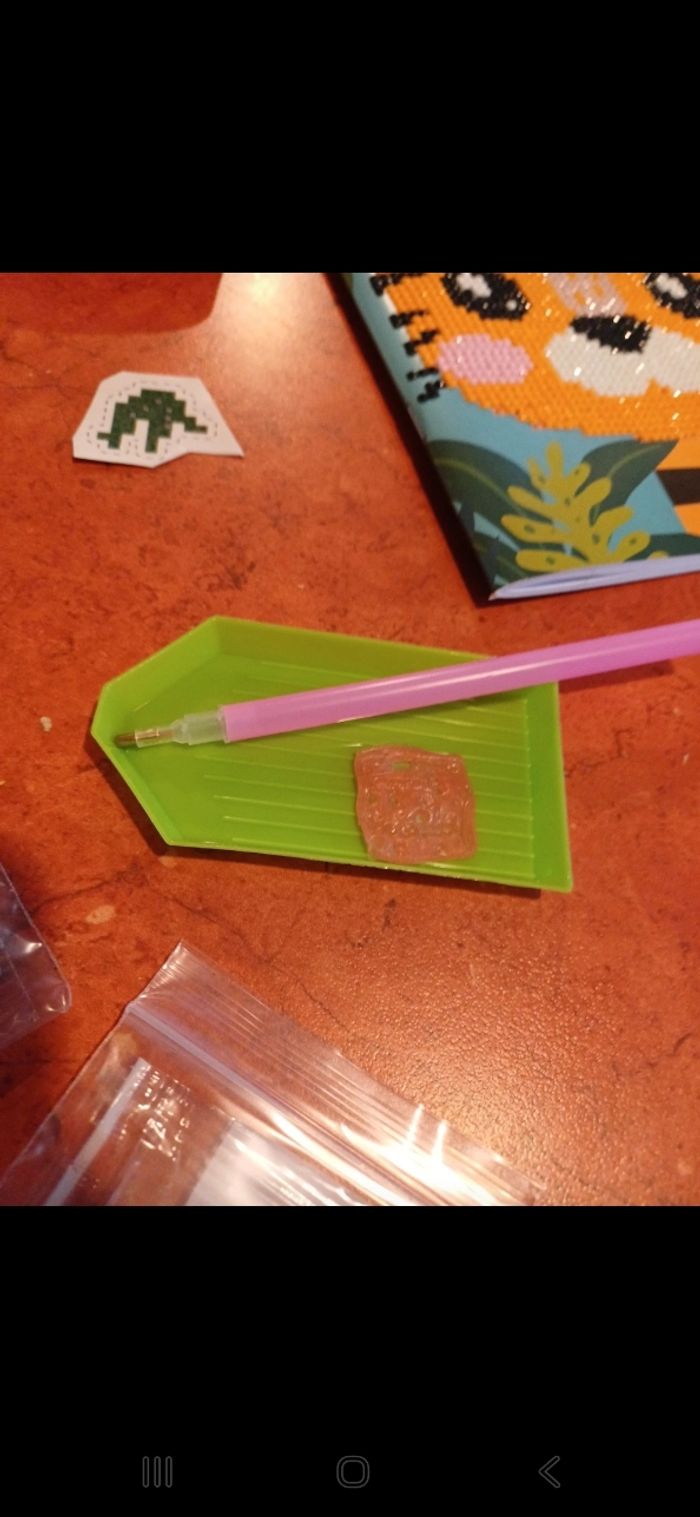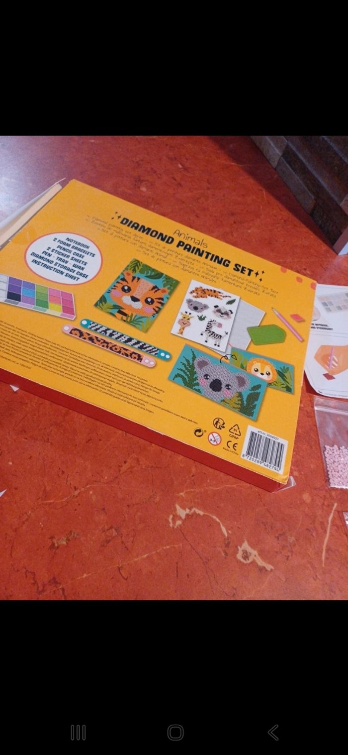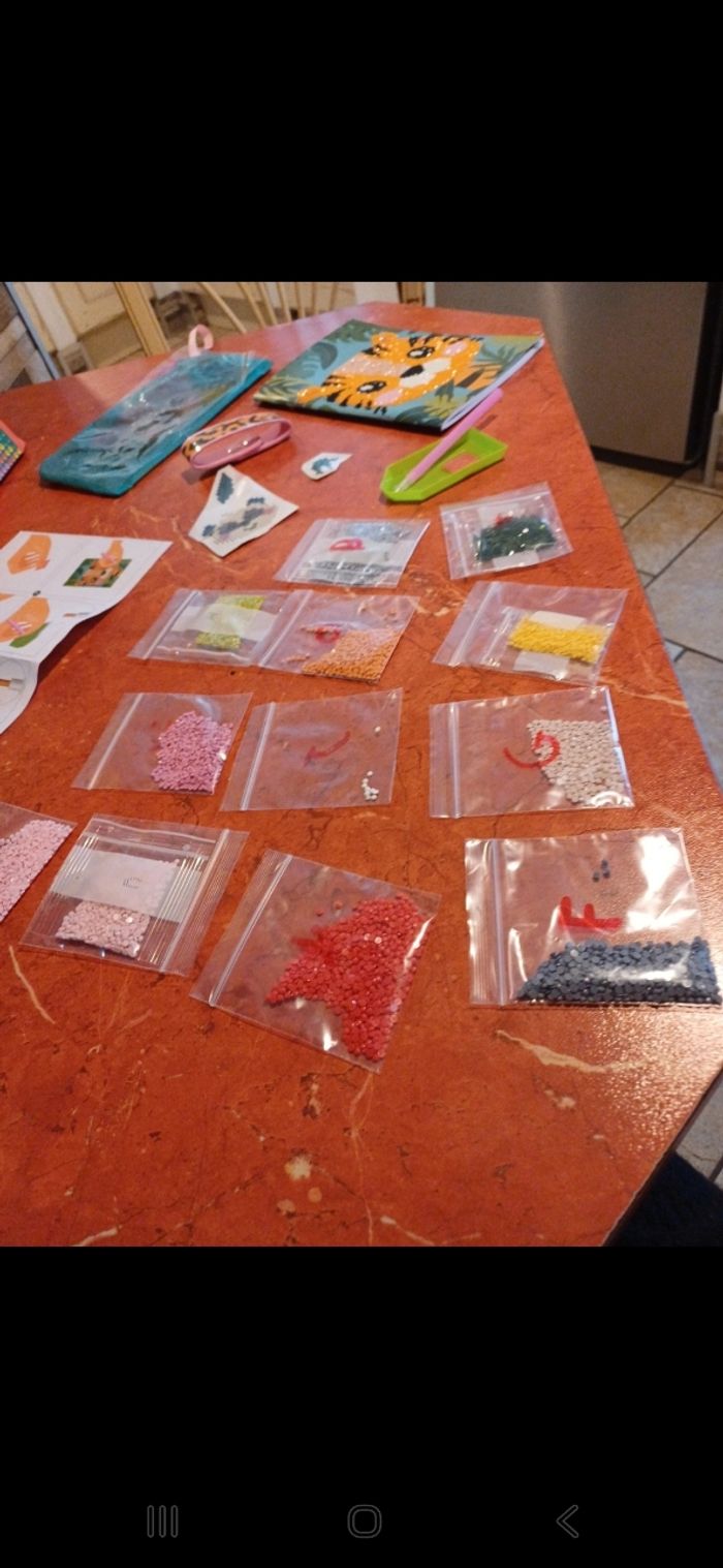 Kit comprenant évidemment les diamants, le récipient, le stylet et la colle ( déjà entamée) . Avec une trousse ( qui reste à faire ) , quelques stickers, un bracelet, et un bloc note qui a déjà été fait mais qui est vide .