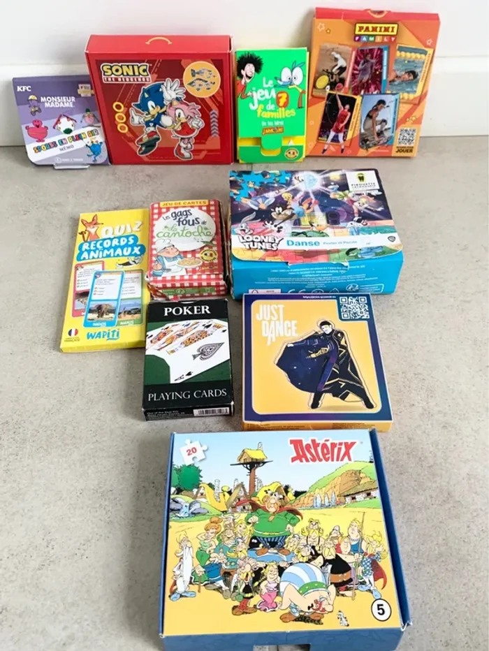 Achète directement l'annonce et dis moi celui que tu as choisi - Jeu des 7 famille j'aime lire gibus emile et Margot, la cantoche, Bonemine, Ariol, Anatole, vampirette - jeu de cartes les gags fou de la cantoche - quiz records animaux wapiti - Lot de 2 puzzles Sonic the hedgehog le hérisson 🦔 Neuf ! Et complet - Poster + autocollants panini : Sur le thème des jeux olympiques d’été de paris. 5 autocollants neufs, jamais ouvert. Poster 1 compléter. boîte d’origine - Jeu just danse : Neuf jamais servi. Boite d’origine. 6 cartes recto verso. Une figurine. Autocollants. Notice - Jeux mémo Monsieur madame : Jeu memory KFC Monsieur Madame. Sports en plein air. Neuf et complet - jeu de carte etc - mini puzzle astérix et obélix