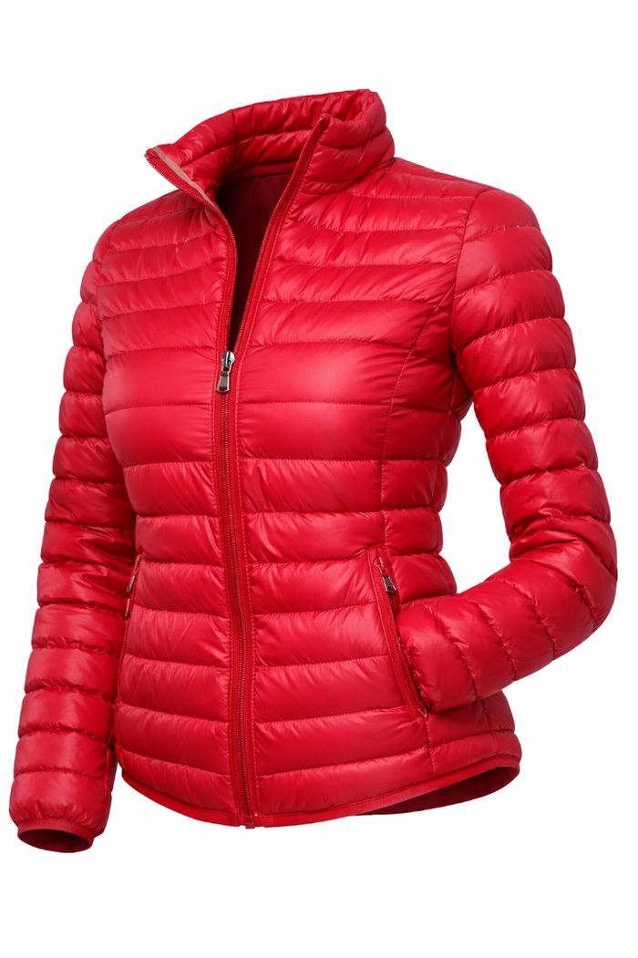 Doudoune rouge, sans capuche, petit col montant, 2 poches côté dont 1 manque le curseur à la fermeture éclair. Rembourrage : 90% duvet 10% plumes.