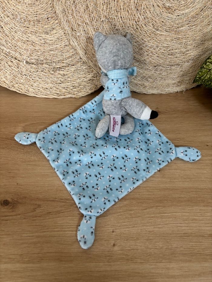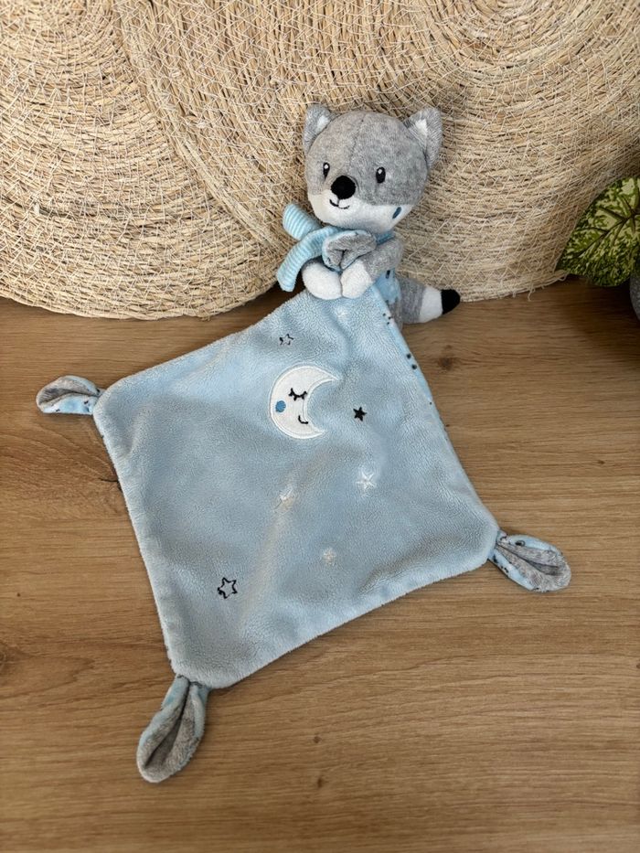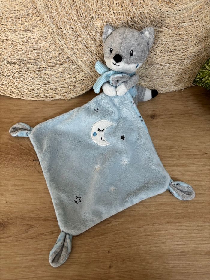 Doudou renard gris bleu mouchoir Lune étoile pommette