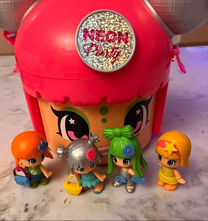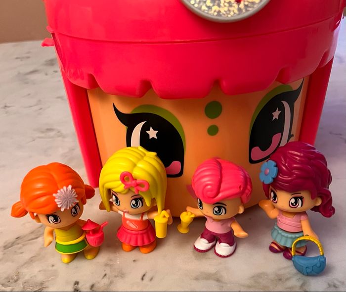 8 figurines Pinypon et leurs accessoires. Toutes les figurines se rangent dans la tête.