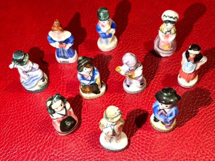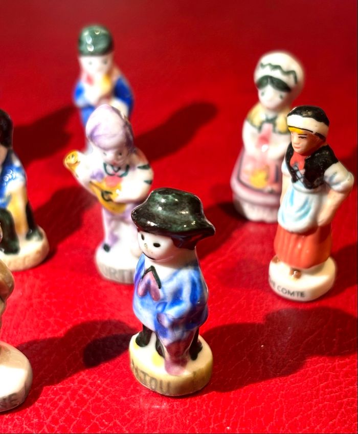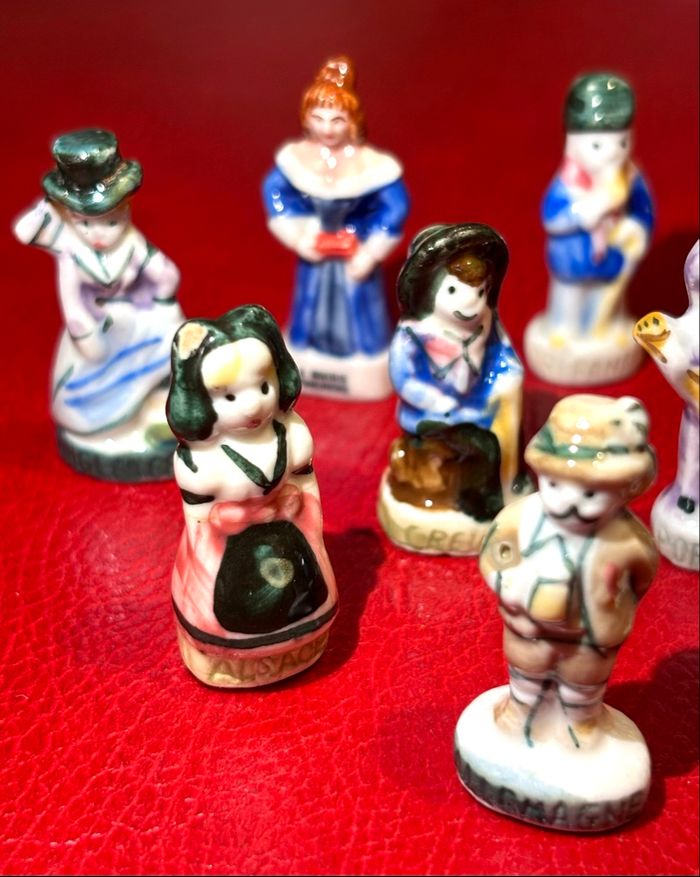 Lot 10 fèves personnages de régions France et des autres pays - Creuse - Allemagne - Angleterre - Alsace **un peu abîmé - Portugal - Nivernais - Orléanais - Anjou - Marie Thérèse - Franche Comté ⛔️ Prix FIXES, NON négociables 🚨  👏🏻 Réductions sur les lots 👍🏻 #feves #figurines #pays #galettedesrois #fevesenceramique