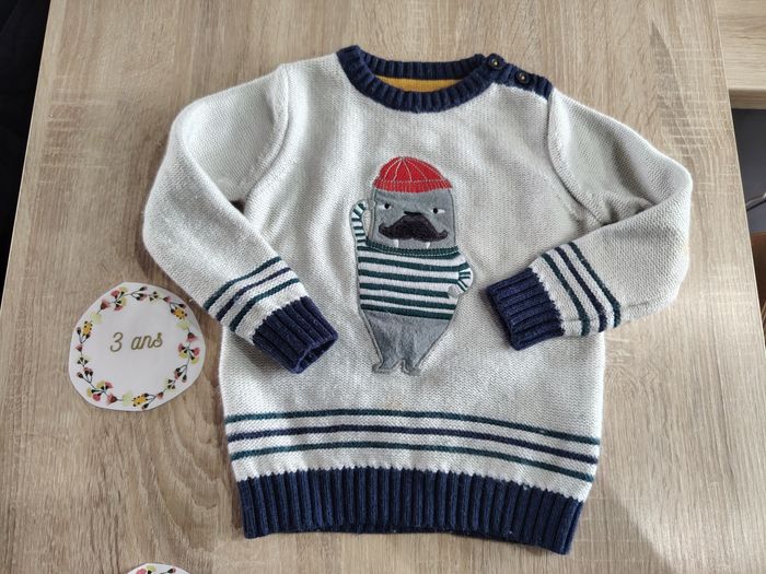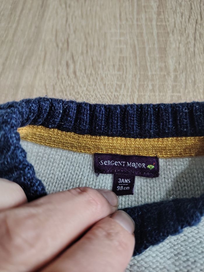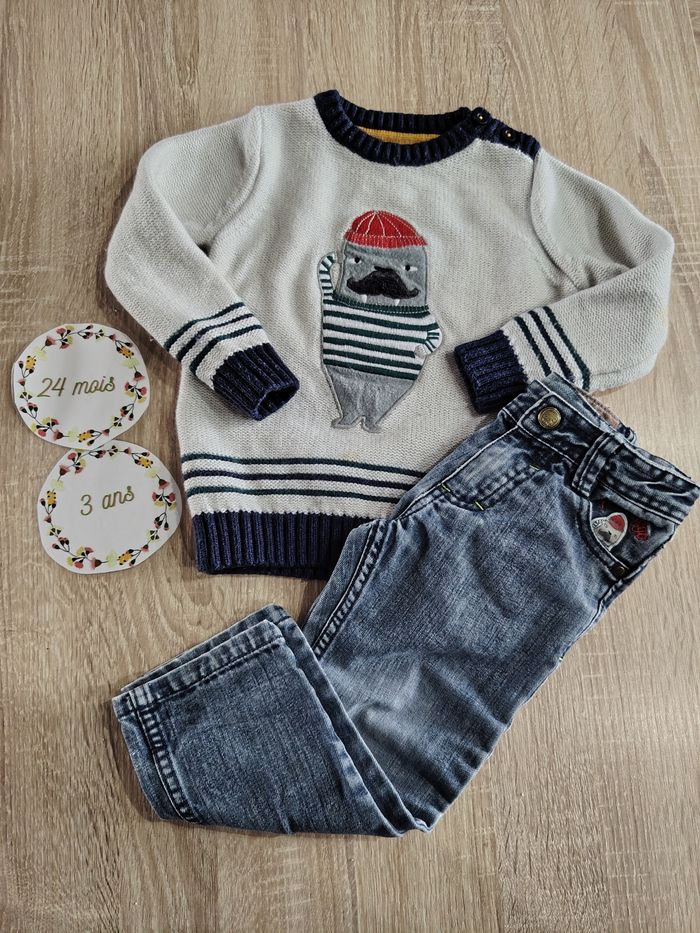 Pantalon en jean en taille 2ans de la marque sergent major en bon état. On peut voir des signes d'utilisation au niveau des genoux d'où le petit prix. J'offre le pull qui va avec car il est taché.