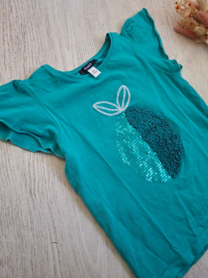 Joli t-shirt turquoise Okaïdi, manches volantées et motif pailleté en sequins sur le devant. Coupe confortable, parfait pour l’été ou la mi-saison 🌿 ✔️ Très bon état Couleur bien vive. 📏 Taille : 6 ans (Okaïdi) 🎨 Couleur : turquoise avec sequins Idéal pour apporter une touche lumineuse à la tenue de votre enfant 💛 Pour rechercher des articles fille 6 ans dans mon dressing: #laure695_fille_6ans #fille#girl#nina#bambina#6ans#6anos#6yearsold#okaidi#turquoise#sequin#ete#printemps#colore