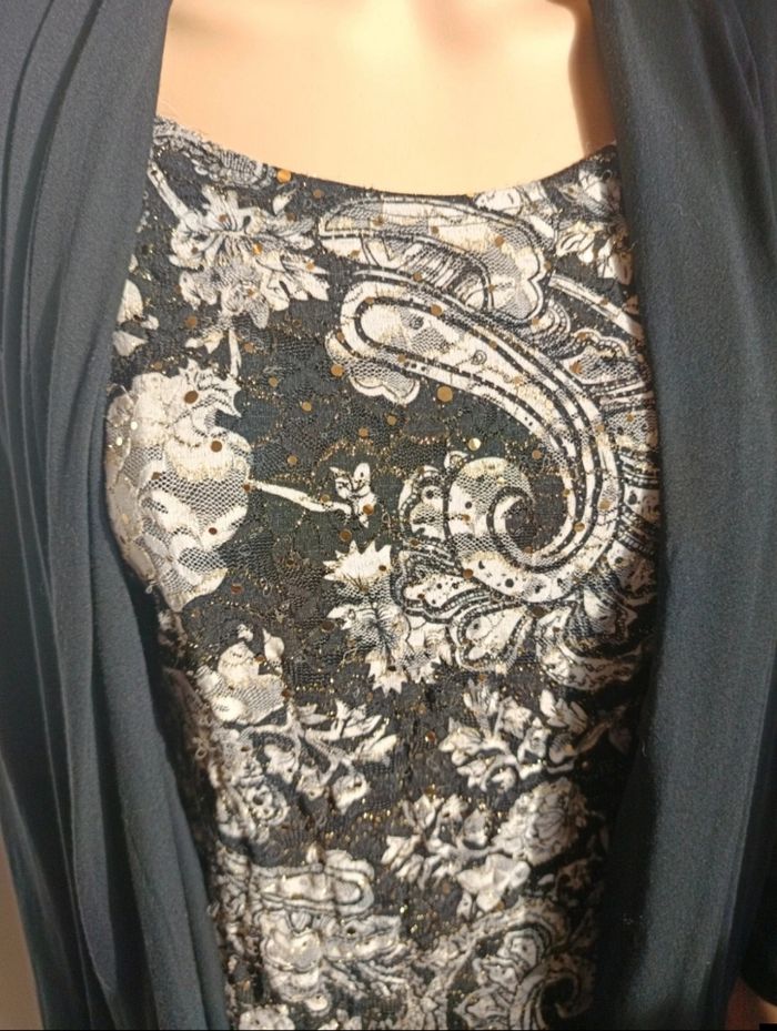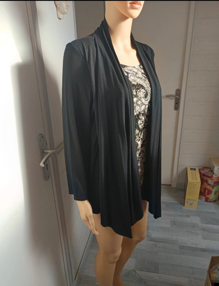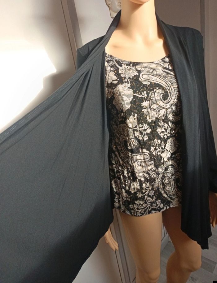 Haut très élégant. Maillot pailleté intégré au gilet noir. N'a plus d'étiquette mais c'est un 40 Épaules 40 Aisselles 41 Longueur 61 pour le maillot, 79 pour le gilet