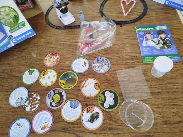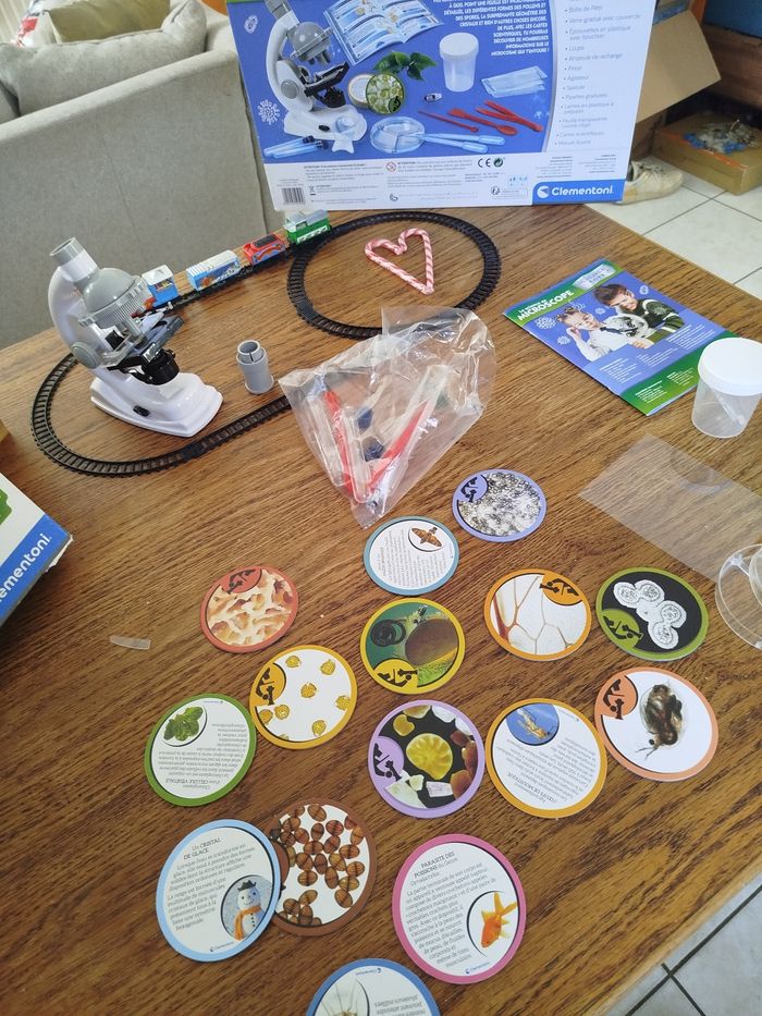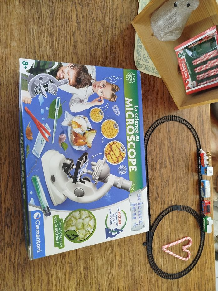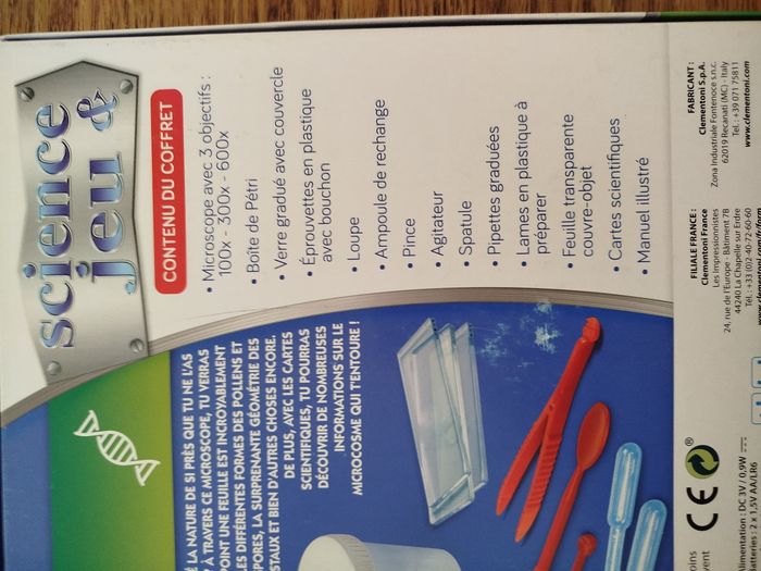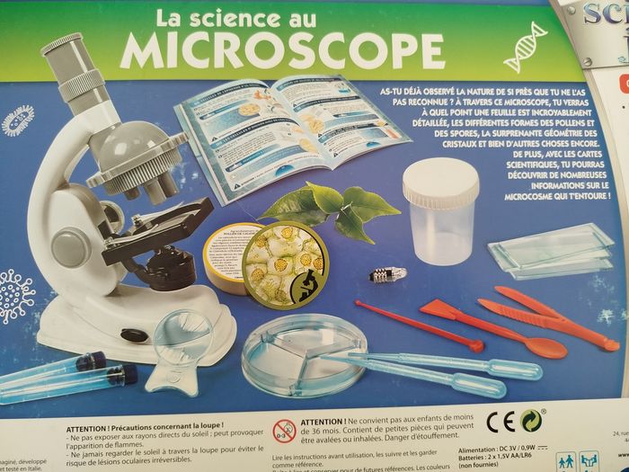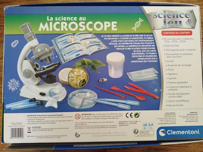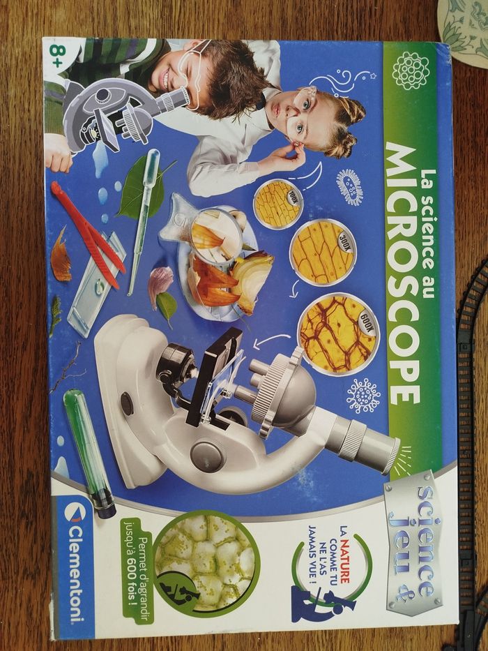 Microscope “La Science au Microscope – La nature comme tu ne l’as jamais vue” – Marque : Clémentoni À partir de 8 ans • Zoom jusqu’à 600x • État : Complet • Excellent état As-tu déjà observé la nature d’aussi près que tu ne la reconnaissais plus ? Grâce à ce microscope, tu vas découvrir un monde totalement invisible à l’œil nu : l’incroyable détail d’une simple feuille, les formes étonnantes du pollen, la géométrie surprenante des cristaux… et tellement d’autres merveilles ! Avec la carte scientifique incluse, tu pourras apprendre plein d’infos fascinantes sur le micro-monde qui t’entoure. Idéal pour un cadeau de Noël ou d’anniversaire, et parfait pour éveiller la curiosité des jeunes explorateurs !