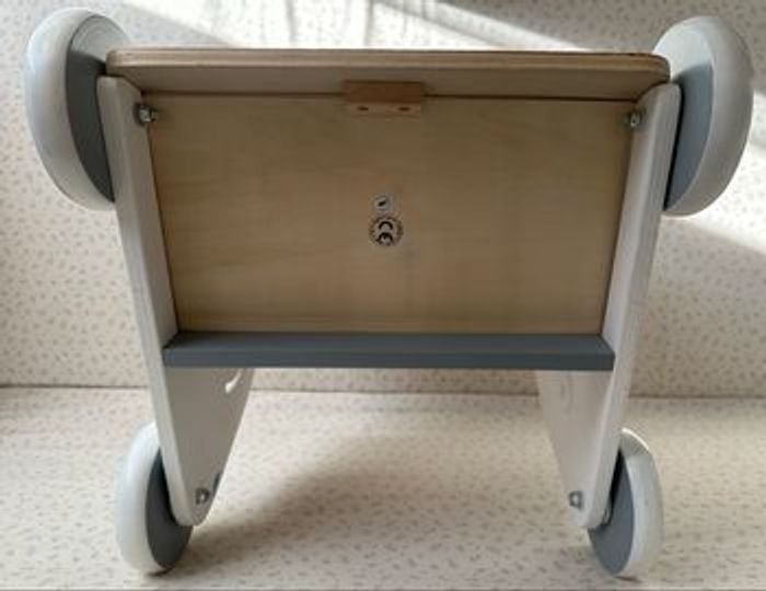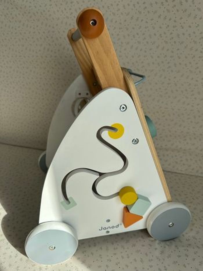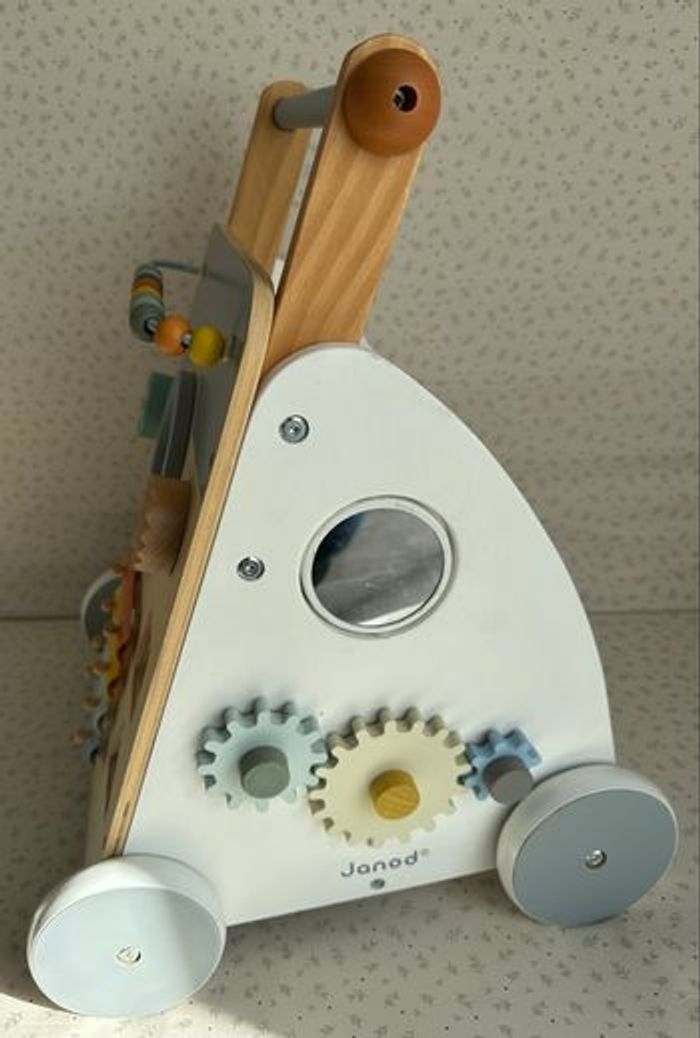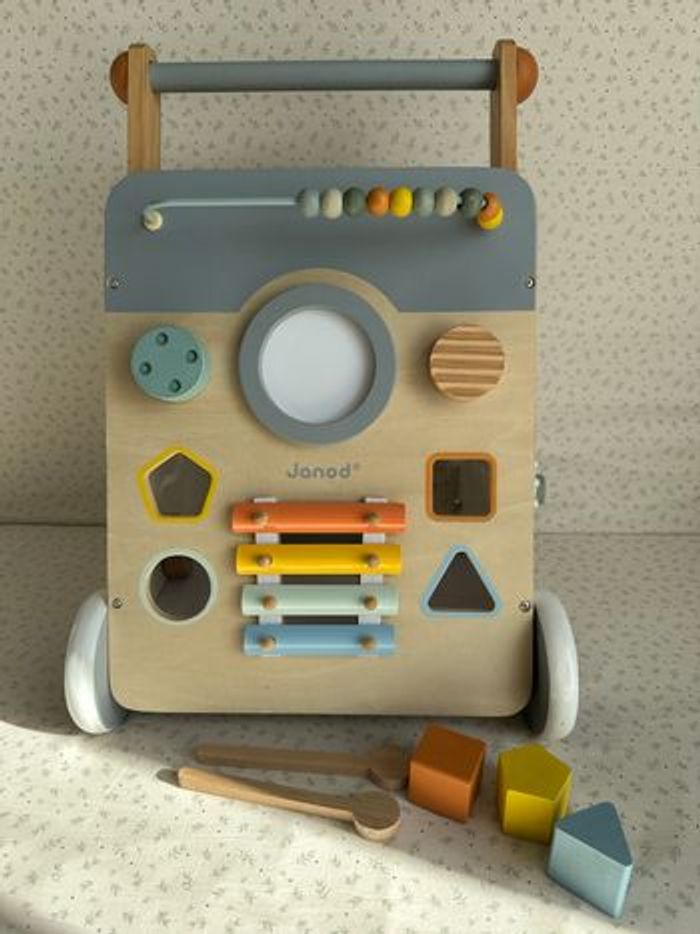 Le Chariot Multi-activités Sweet Cocoon de Janod sera particulièrement adapté à l’apprentissage de la marche. Il accompagnera votre enfant en toute sécurité dès l'âge de12 mois. Grâce à son frein invisible et amovible, les roues pourront être bloquées puis libérées progressivement afin de toujours maîtriser l'allure. Proposant neuf activités ludiques, ce charriot permettra également à votre tout-petit d'exercer sa motricité fine et sa dextérité. Il y retrouvera un boulier, une boîte à forme, un labyrinthe, des engrenages, un bouton rotatif sonore, un miroir grossissant rotatif, un tambour, un xylophone et un gratte-gratte. Afin d'atténuer le bruit de la chute des cubes, un tapis en feutrine a été positionné à l'intérieur du chariot. Les roues seront également particulièrement silencieuses. Caractéristiques : Chariot Multi-activités Sweet Cocoon Système de freinage invisible et amovible Matières : Bois et feutrine Dimensions : L. 37 x l. 34,5 x H. 47,5 cm Age : A partir de 1 an Très peu utilisé comme en atteste l’état des roues. Acheté 65€ Maison non fumeuse et sans animaux À récupérer monté ou envoi dans sa boîte d’origine