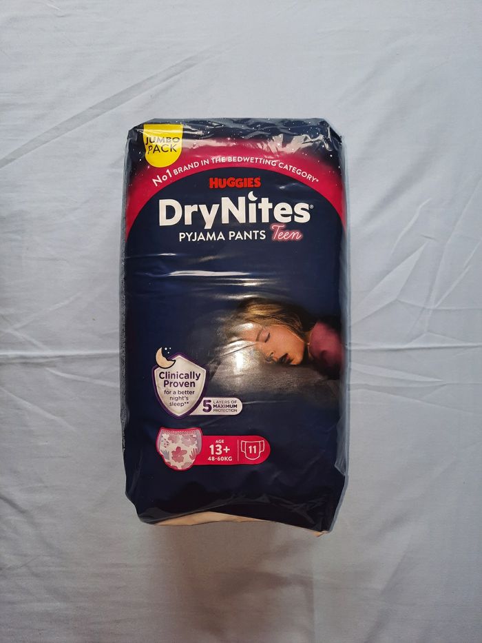 paquet neufs de DryNites Pyjama Pants Teen de la marque Huggies, spécialement conçus pour les adolescents sujets à l’énurésie nocturne.