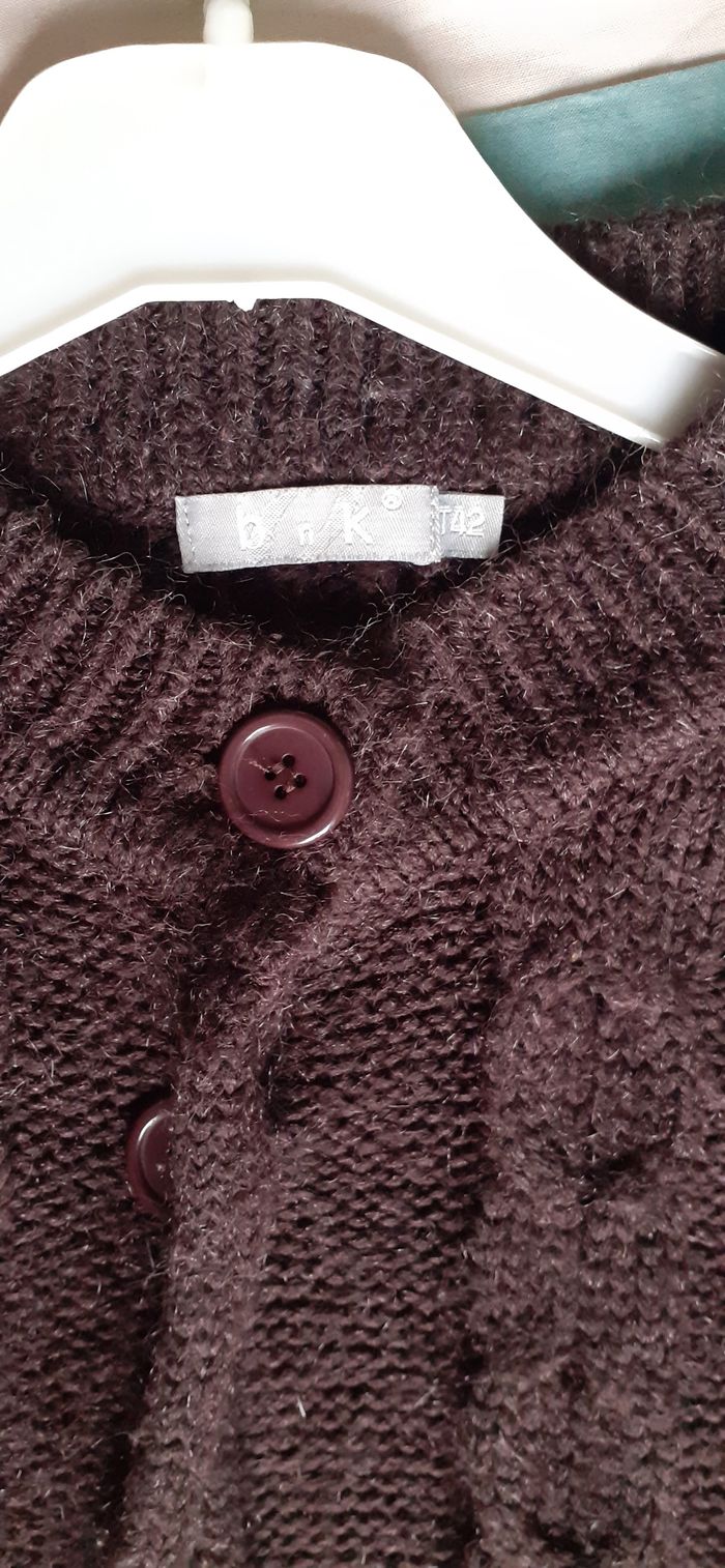 Vends un gilet en maille, doux et souple, 2 boutons pour fermer, 2 poches, couleur marron foncé, marque BNK, taille 42. Longueur de l'épaule à la base : 56 cm Largeur aisselle à aisselle : 50 cm. #claire12806femmetaille42