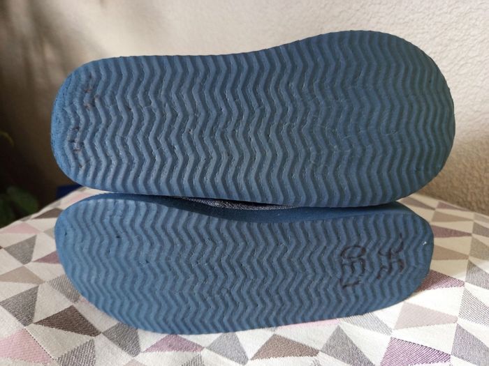 Bottines fourrées en suédine bleues, Tex, plus d'étiquette de taille mais c'est une pointure 30, peuvent être utilisées comme chaussons, bon état.