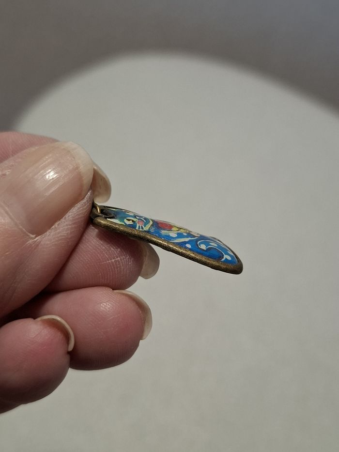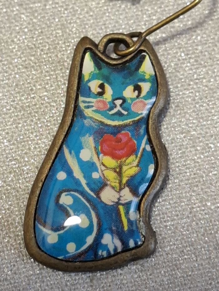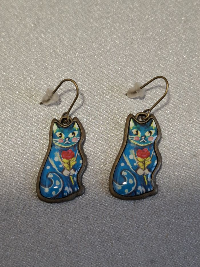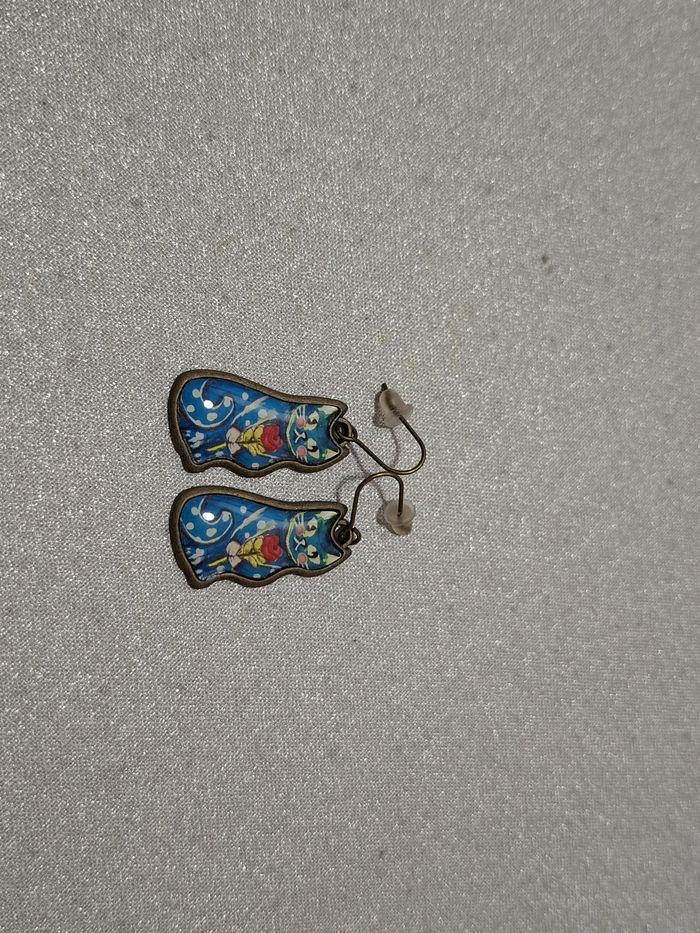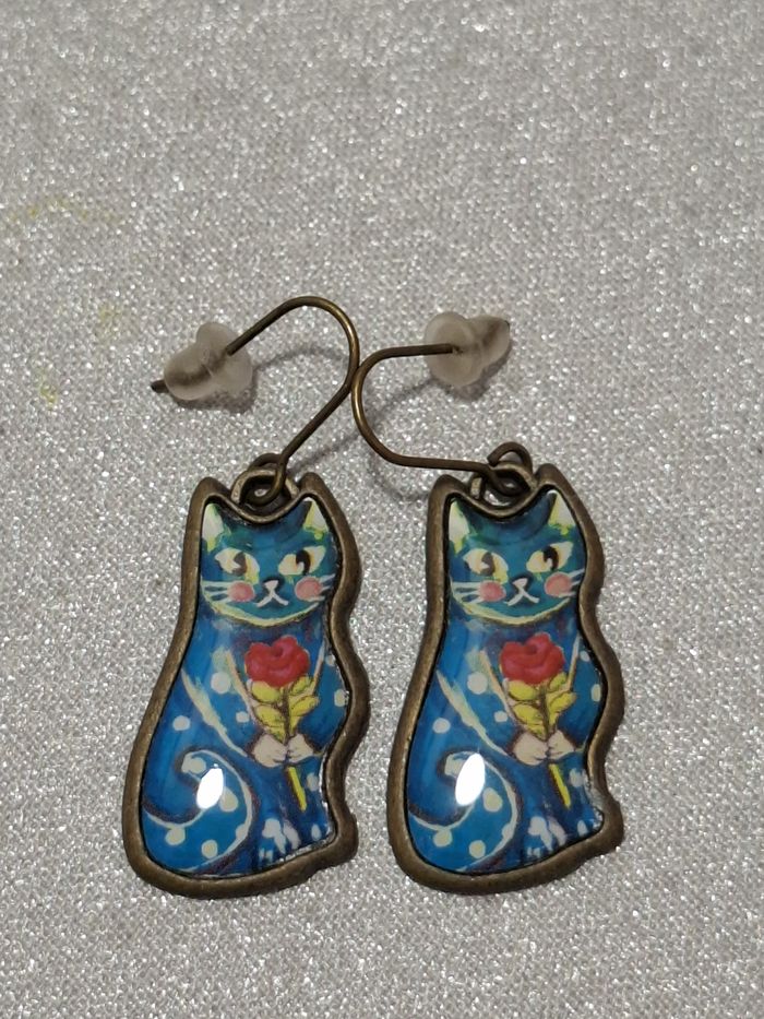 Jolies boucles d'oreilles métal vieilli cuivré chat bleu émaillé très bon état - photo numéro 8