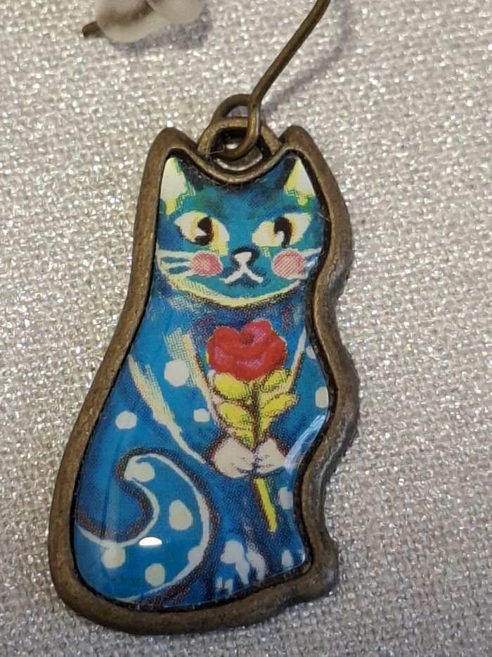 Jolies boucles d'oreilles en métal vieilli cuivré, joli chat bleu émaillé tenant une rose, hauteur totale 4 cm, largeur environ 1,5 cm et en excellent état (peu portées). Ferait l'objet d'un joli cadeau pour une amoureuse des chats.
