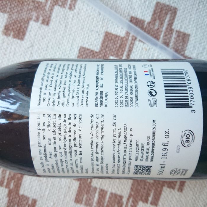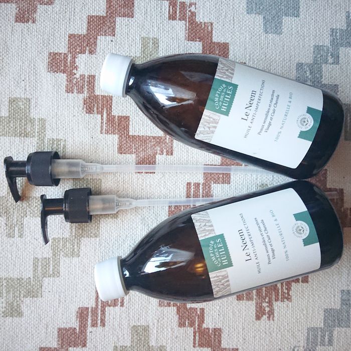 Lot de 2 Huiles de Neem Bio Comptoir des Huiles - 2 x 500ml - Certifiées Bio - 2 bouchons pompe noir - Neuves, non ouvertes - Idéale pour les peaux à problèmes/soins de l'acné - Visage, corps et cheveux - Cuir chevelu irrité - 100% naturelle et certifiée COSMO NATURAL L'huile de Neem est indispensable pour les peaux à problèmes, ses propriétés antibactériennes et assainissantes permettent de purifier les imperfections. Si vous avez des questions, n'hésitez pas ;)