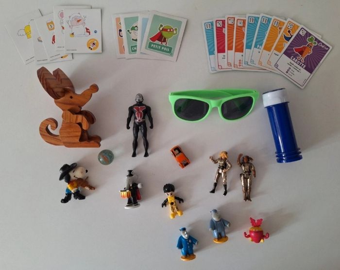 Une mini voiture qui clignote, 2 figurines en métal, une figurine noire, un Snoopy, un Babar, 2 hippopotames, une figurine dont le corps se sépare, un calot, une figurine pour bout de crayon, un récipient pour faire des bulles, une souris en bois, une paire de unettes de soleil et un lot de 18 cartes et autocollants "chef club" (un double).