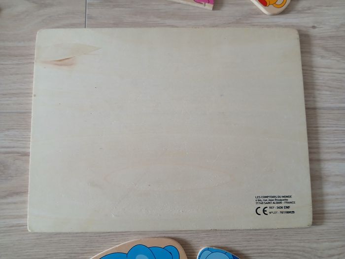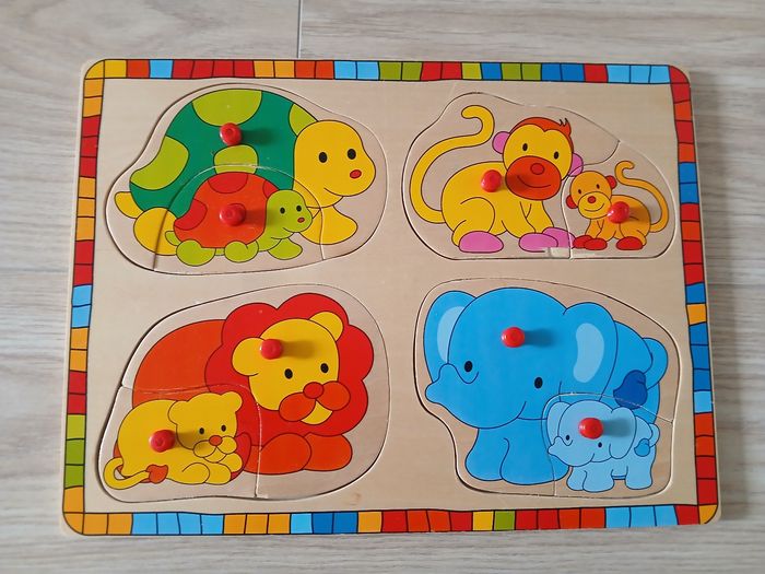 Jeu de formes a placer sur le thème des animaux, un animal et son petit (tortue, singe, lion et éléphant) en bois. Marque Les Comptoirs du Monde. Bon état. Un petit éclat au bois sur la forme du singe et de son petit.