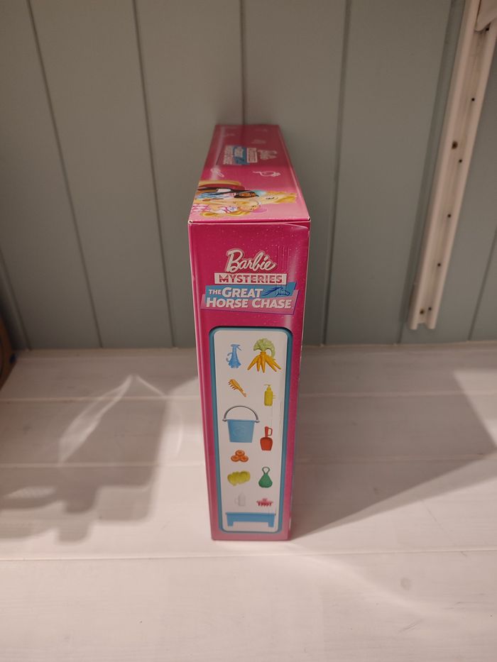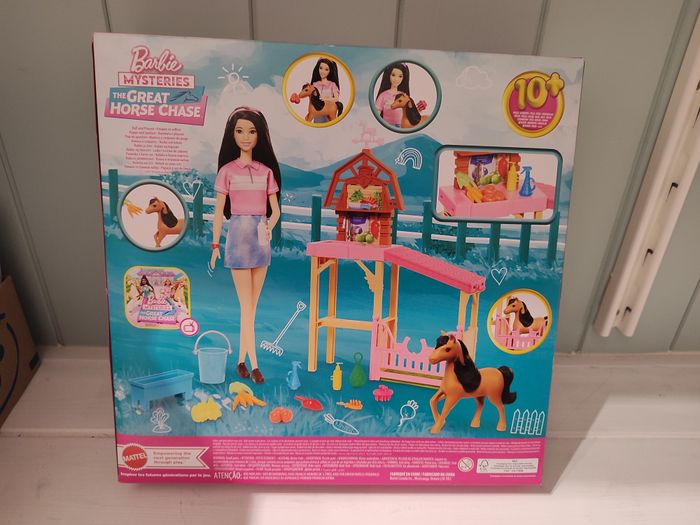 Ce set contient un coffret écurie Barbie avec 1 poupée portant un haut, une jupe, des chaussures, une montre et un bandeau, ainsi qu’un petit cheval et 14 accessoires. Le coffret comprend 4 espaces de jeu, dont une écurie, une zone d’alimentation, un évier et une barrière extensible.
