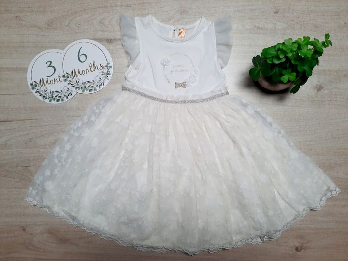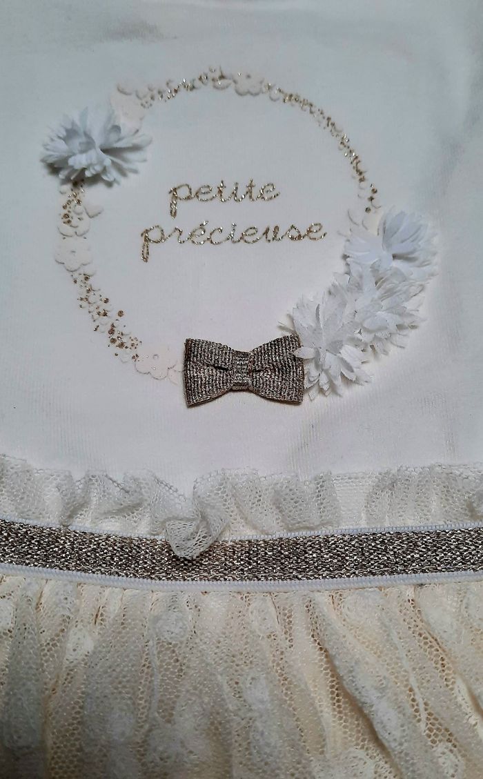 ✨️magnifique robe manches courtes en tule brodé doublé couleur crème inscription "petite précieuse"