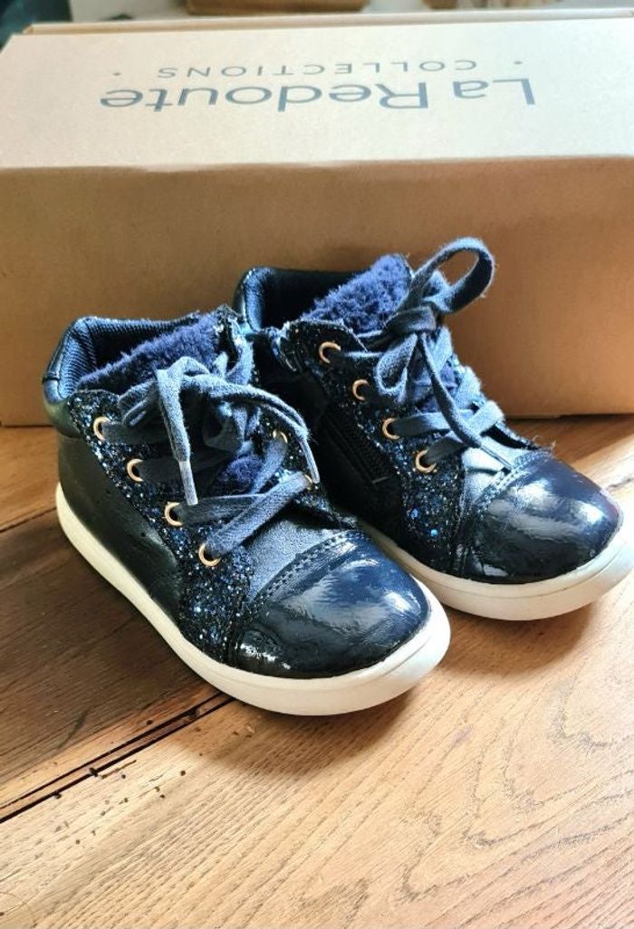 Ont été portées 1 saison en alternance avec d'autres chaussures. Languettes en fausse fourrure bleu marine. Détails pailletés et pointes + talons vernies. Pointure 25. La redoute.