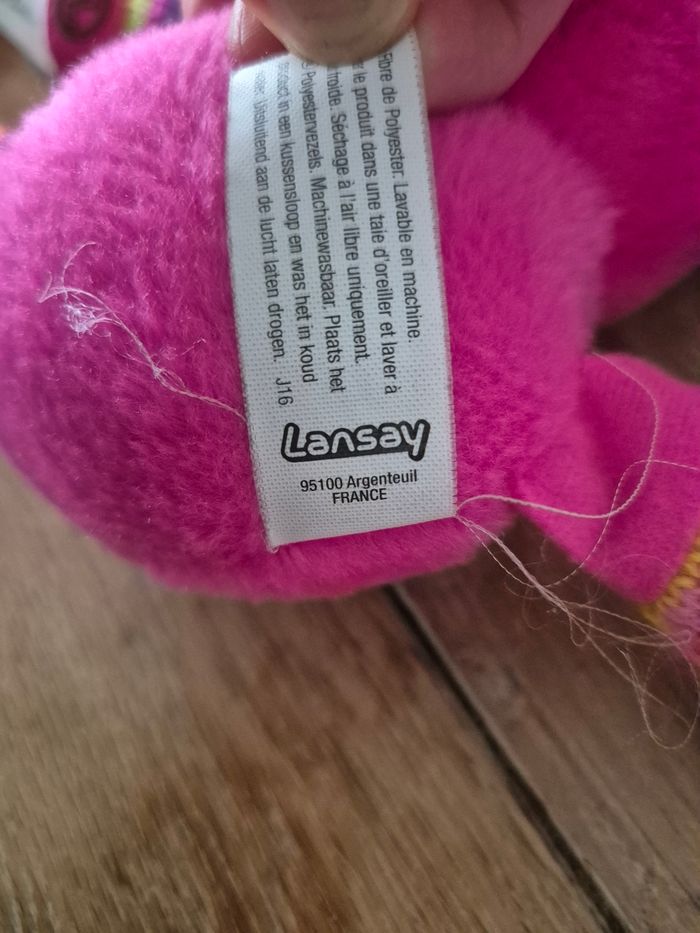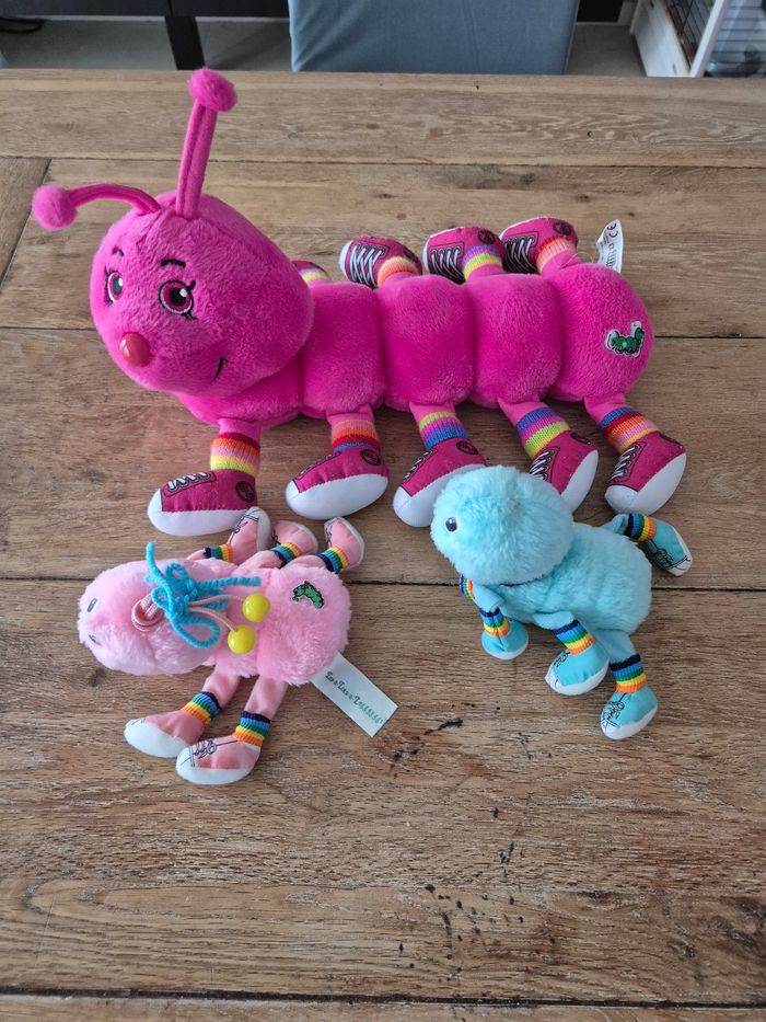 Lot peluche Mille Papattes 1 grand fuschia : longueur 30cm 1 petit rose : longueur 10cm 1 petit bleu (sans antenne) : longueur 10cm Lansay