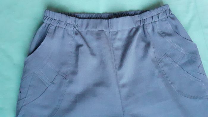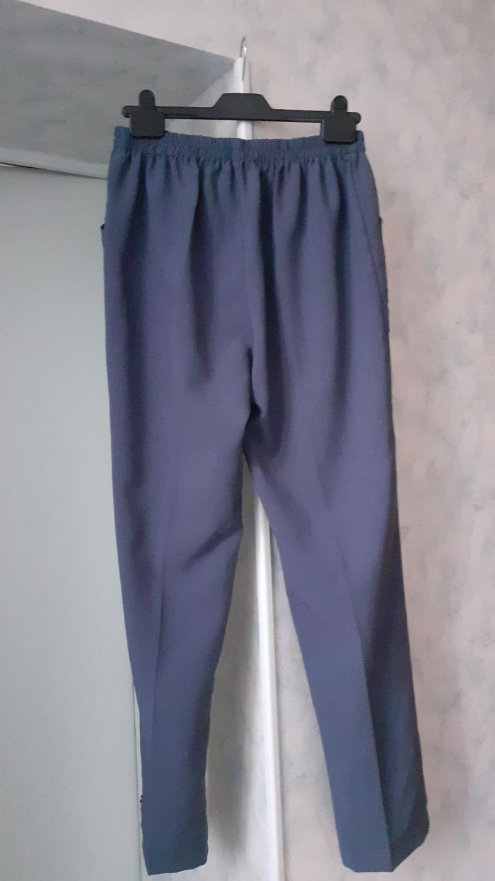 Vends un pantalon 75 % polyester, 20 % viscose, 5 % élasthanne, 2 poches latérales, ceinture élastique, petites fentes et 2 boutons au bas des jambes, très bonne tenue, couleur bleu pétrole, taille 3 sur l'étiquette, 44.