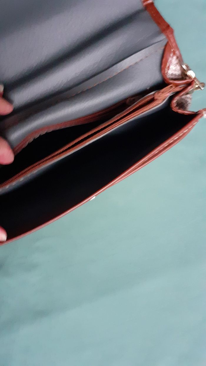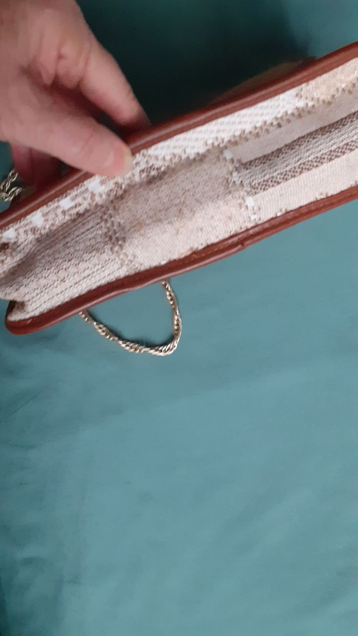 Vends un sac à main avec poignée et bandoulière en chaîne, 2 compartiments, une poche arrière zippée, une poche zippée à l'intérieur, couleur beige et marron. Dimensions : 26 cm X 19 cm.