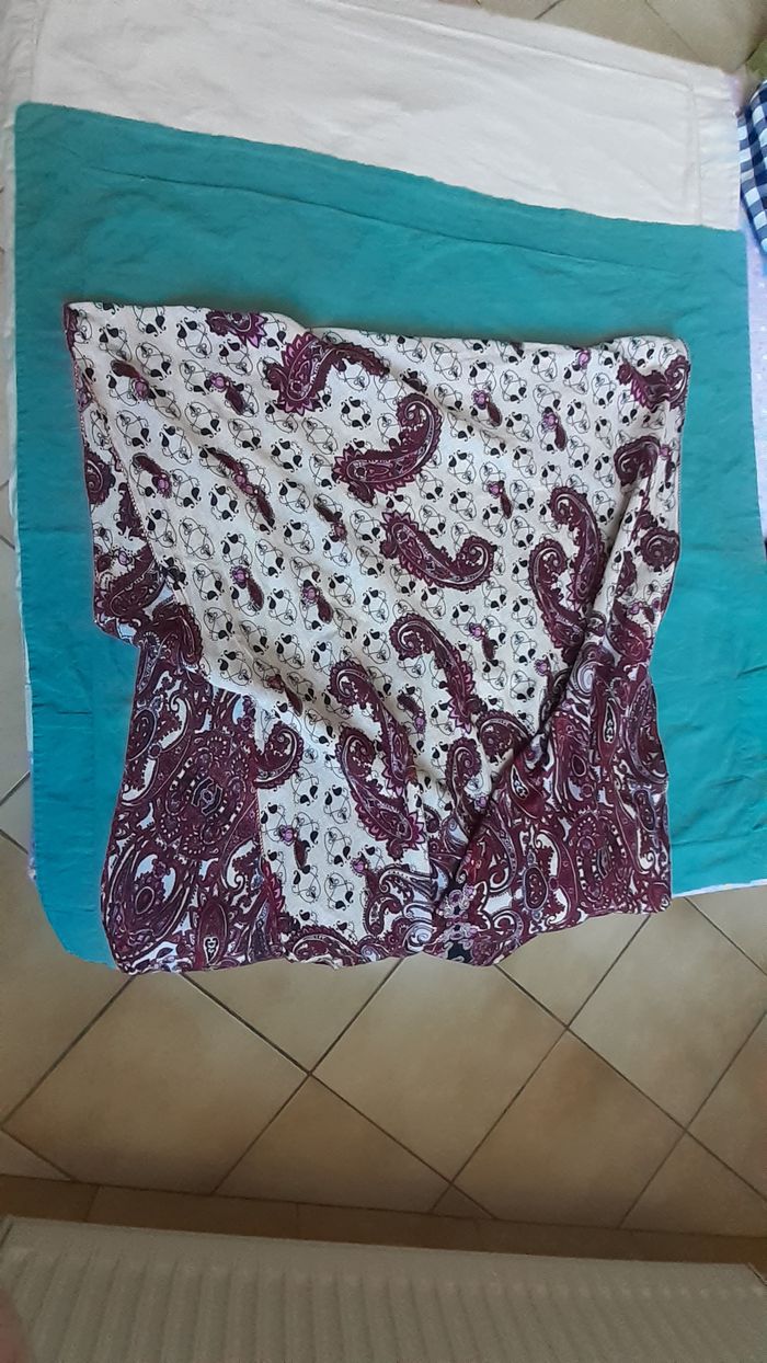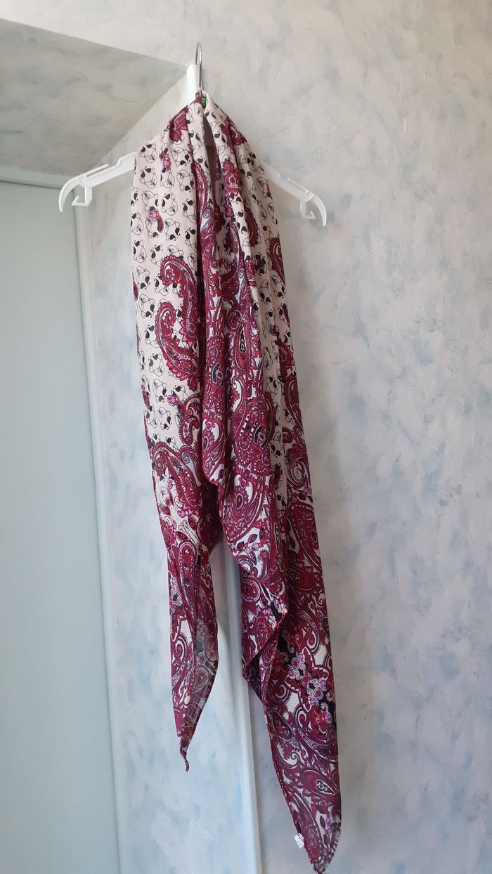 Vends une écharpe 100 % coton, très fine, taillée en pointe aux extrémités, couleur beige avec motifs noirs et prune. Longueur : 204 sur le côté le plus long et 116 cm sur le côté le plus court. Largeur : 60 cm.