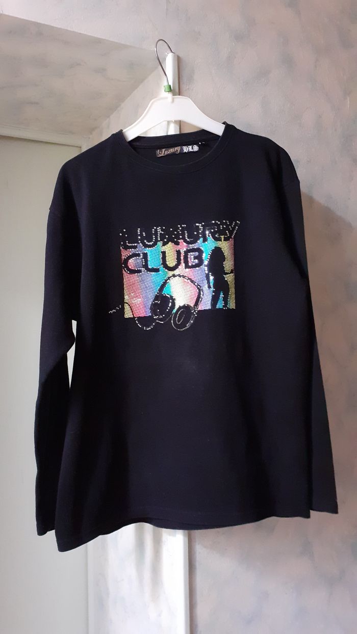 Vends un sweat coupe droite 100 % coton épais, couleur noir avec couleurs fluo devant et strass, marque Luxury, taille XL 42-44. A noter : quelques strass sont partis. Longueur de l'épaule à la base : 64 cm Largeur aisselle à aisselle : 51 cm Largeur au niveau des hanches : 53 cm.