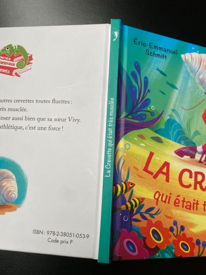 livre jeunesse "La crevette qui était très musclée" de Eric-Emmanuel Schmitt et Florence Guiraud. - Titre : La crevette qui était très musclée - Auteur : Eric-Emmanuel Schmitt - Illustrateur : Florence Guiraud - Éditeur : Hachette Jeunesse - Genre : Roman État neuf