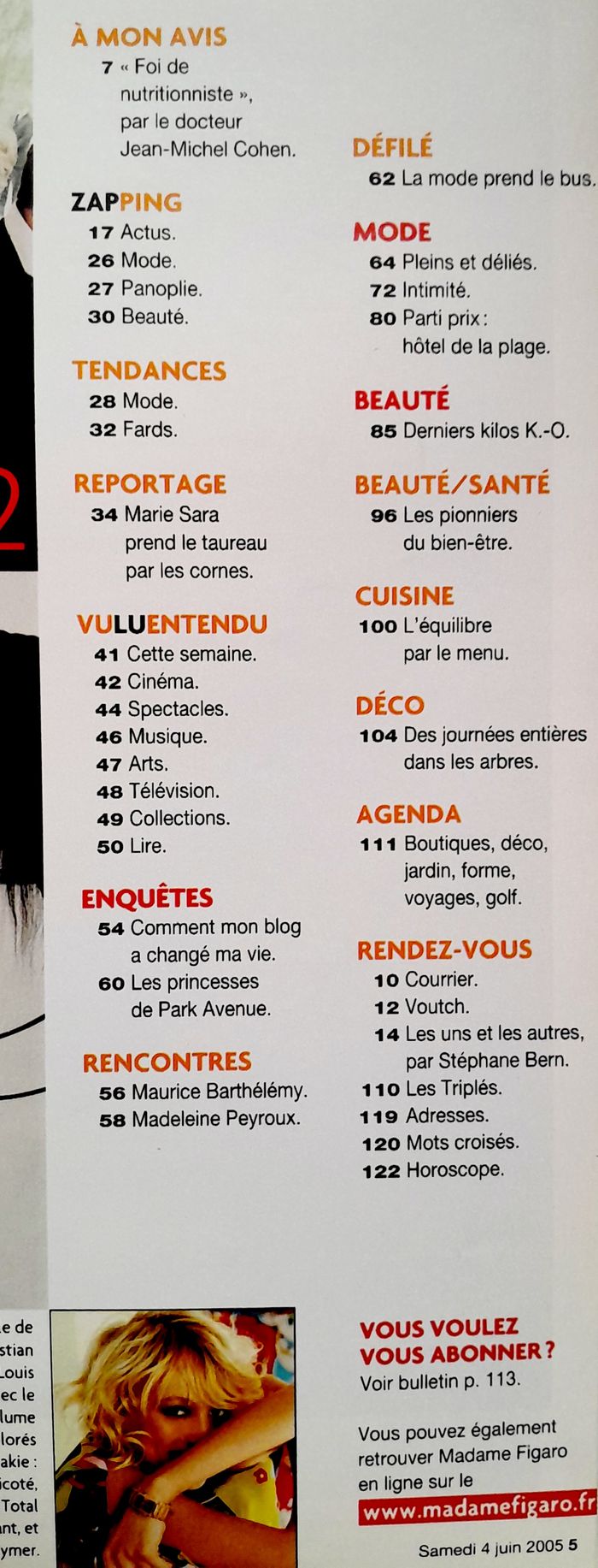 spécial Marie Sara, Maurice Barthélémy, les princesses jet setteuses blondes, la mode prend le bus, Madeleine Peyroux, mode pleins et déliés, mode intimité, mode hôtel de la plage, beauté derniers kilos K-O, cuisine équilibrée, déco des journées entières dans les arbres...