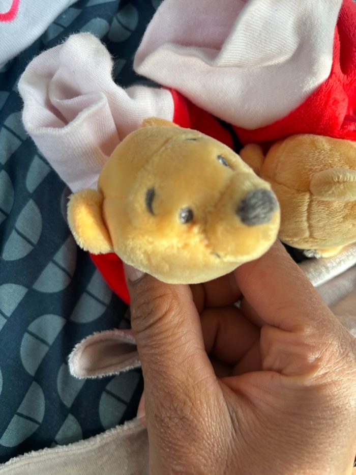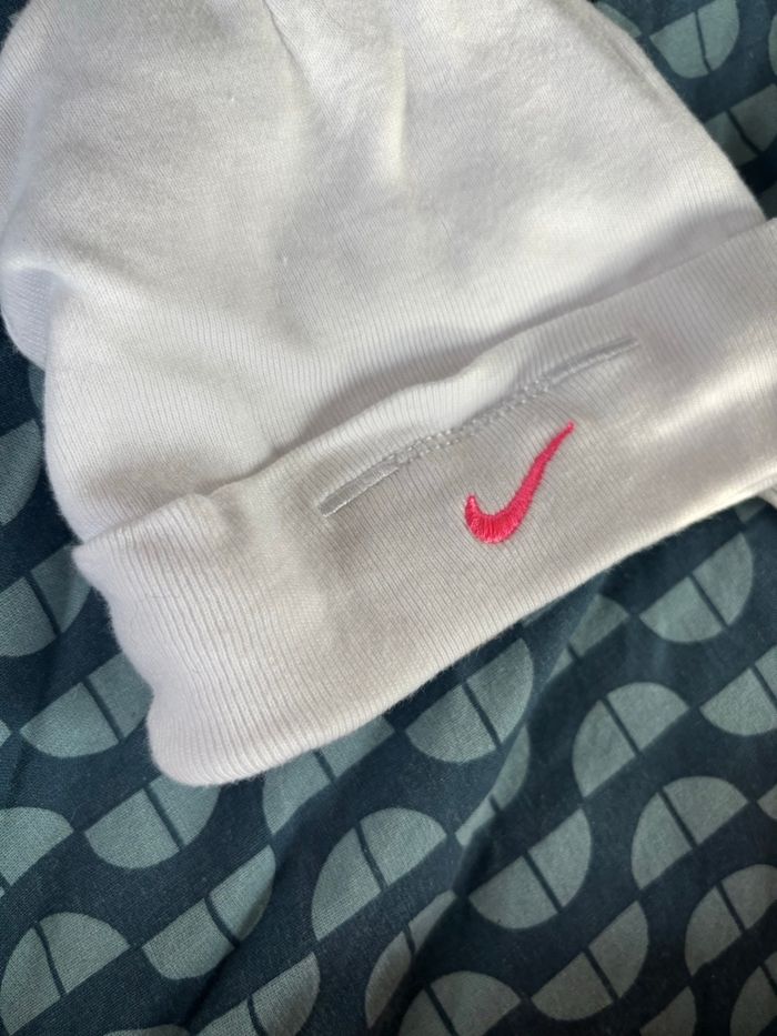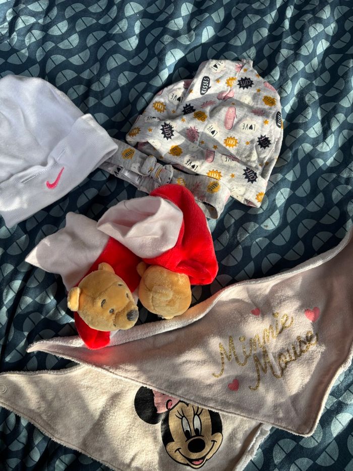 Divers marques et tailles. Bonnet et bandeau « bulles BD » : Zeeman en coton et taille unique, chaussons a hochet Winnie the Pooh Disney 6 mois la tête de Winnie fait un bruit de hochet, bonnet Nike 0-6 mois (60-70cm), 2 bavoirs Minnie Disney 0-6mois coton.