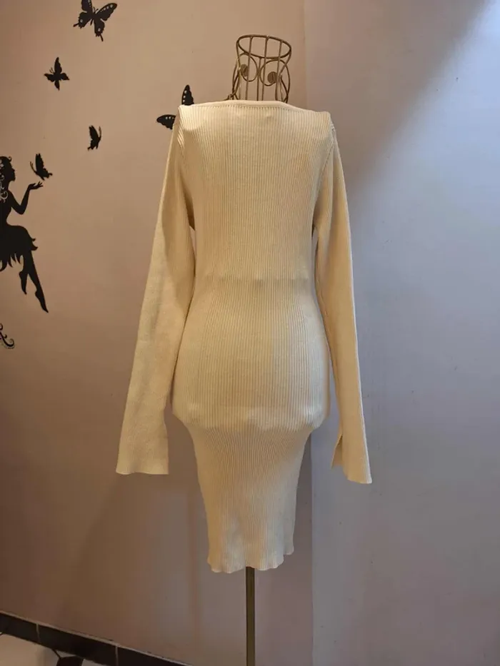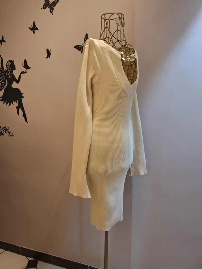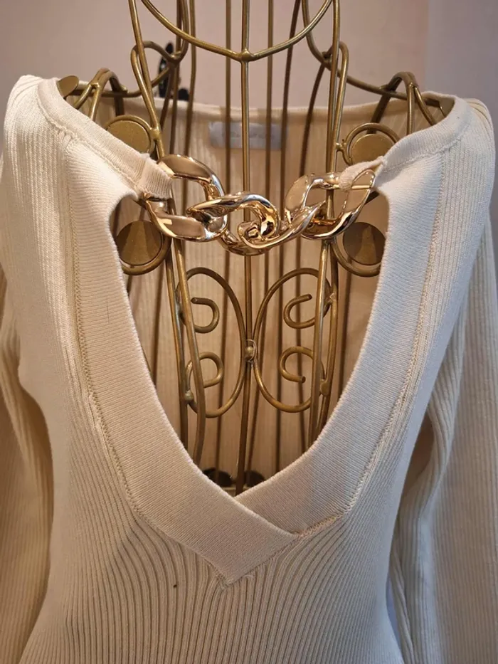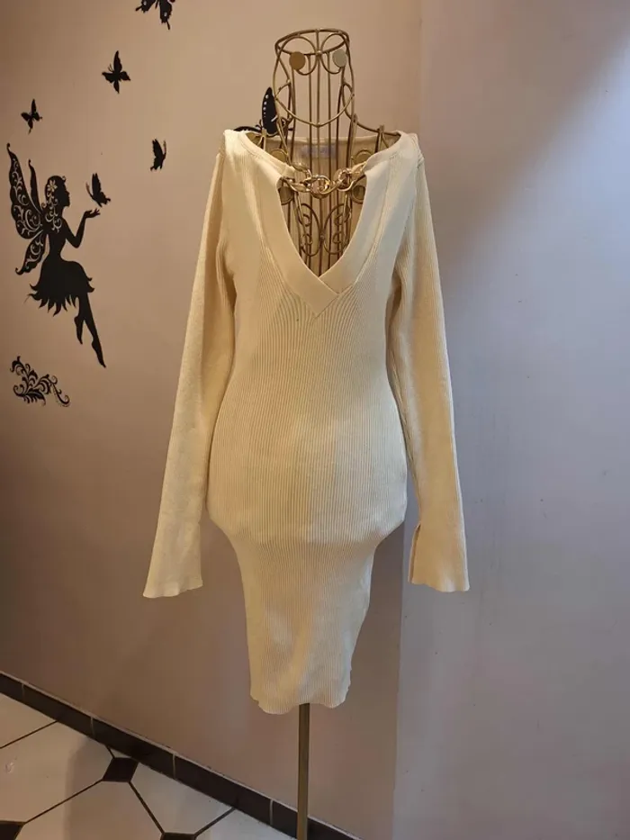Robe pull crème en mailles côtelées - Col V avec chaine dorée - longueur 90 cm - coupe cintrée et moulante : la matière est extensible et s'adapte à votre morphologie - taille unique idéale pour les tailles S & M ou 36 & 38 - état sans défaut ps : je ne fais pas de photo portée #robepull #robemailles #robepullcrème