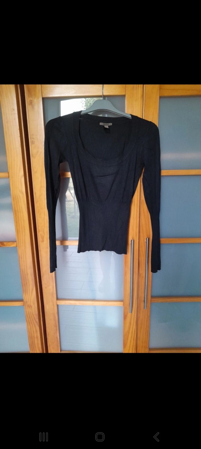 Pull fin noir, bas et manches resserrées pour un bel effet, confortable et en parfait état