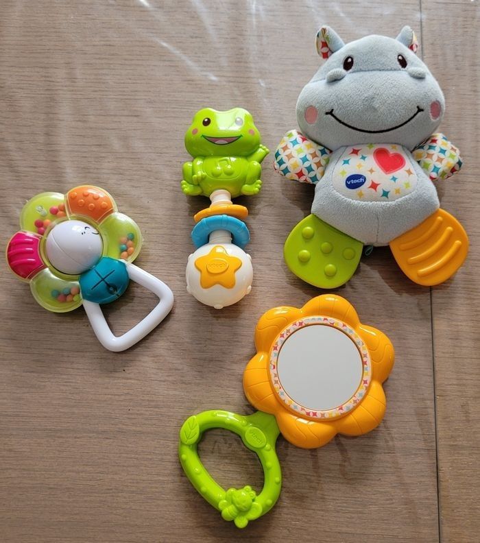 Différents hochets permettant différentes stimulations sensorielles et motrices.