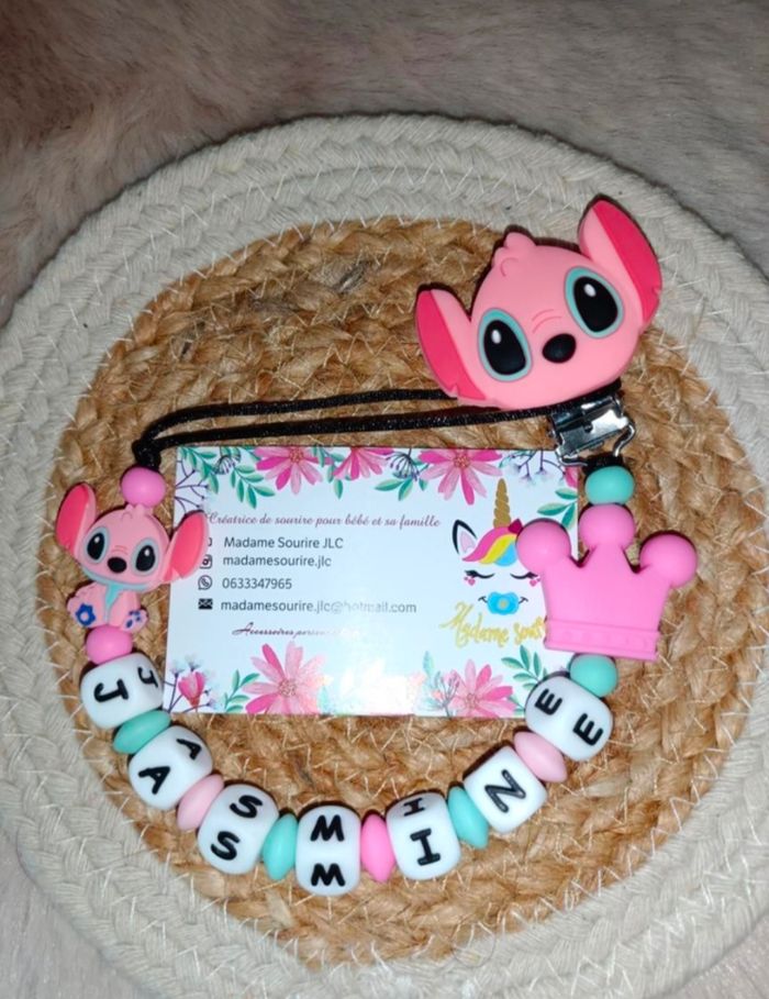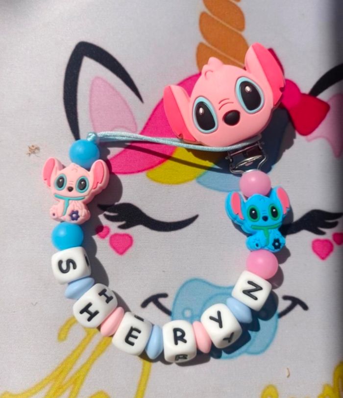 Une Attache tétine Angel Stitch pour ne plus perdre la tétine avec une boucle pour attacher celle-ci (adaptateur MAM disponible pour les tétines MAM dans les accessoires) et un clip pour accrocher l'attache à un tissu sans l'abîmer. Respect des normes CE, composée de perles silicone alimentaire et/ou bois naturel. 100% personnalisable, énormément de choix de clips, perles, etc… Envoyez-moi un message afin de créer main dans la main votre accessoire idéal. Une photo du prototype de celui-ci vous est envoyé pour validation avant envoi.