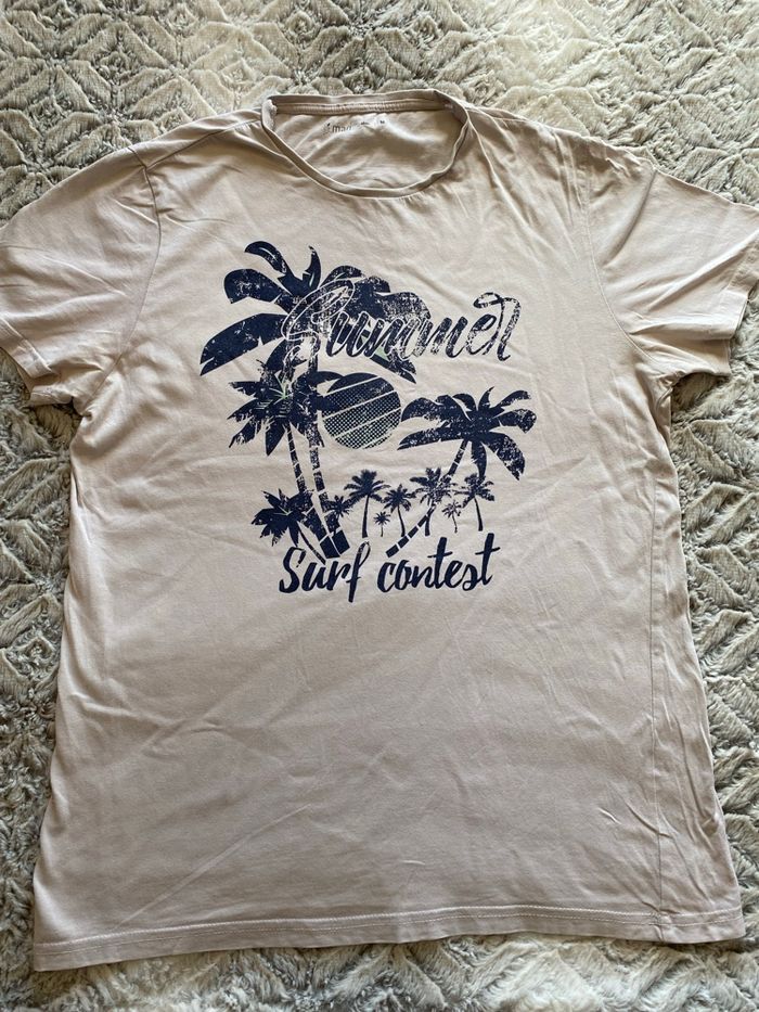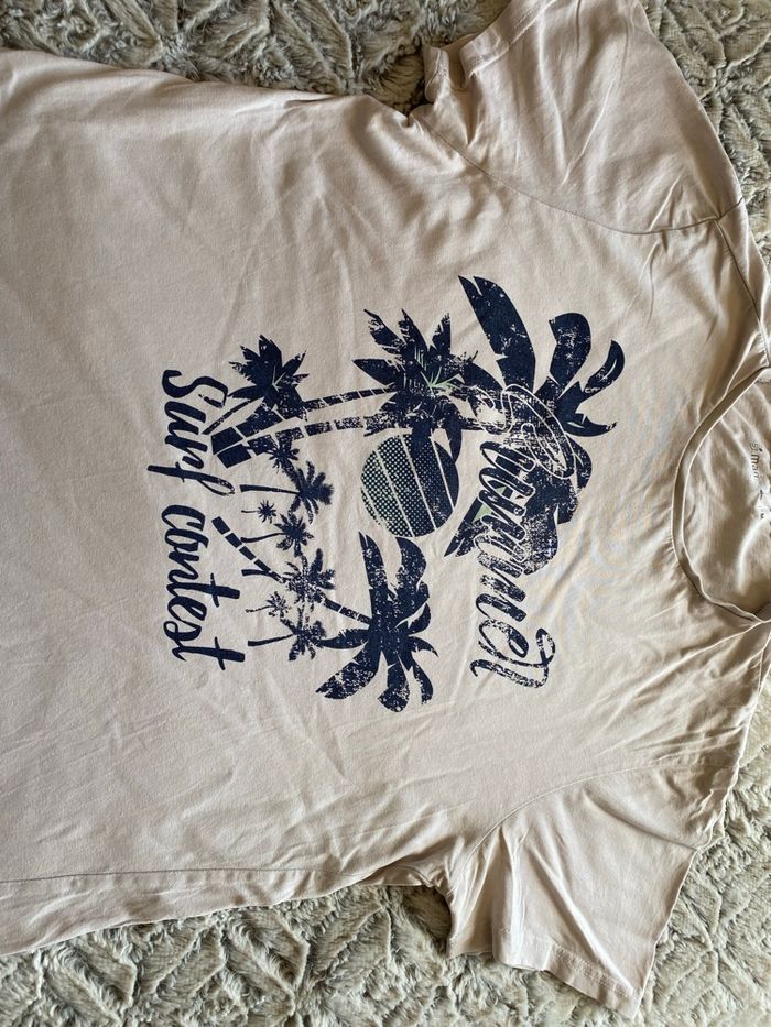 Je vends ce t-shirt blanc de la marque Gemo avec un motif imprimé représentant une scène de surf.