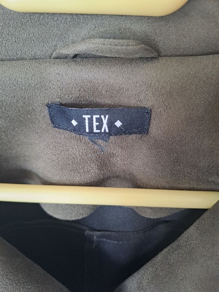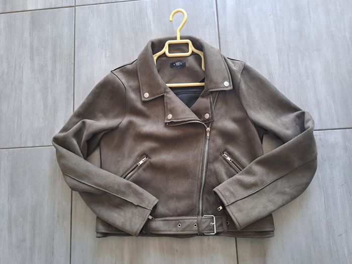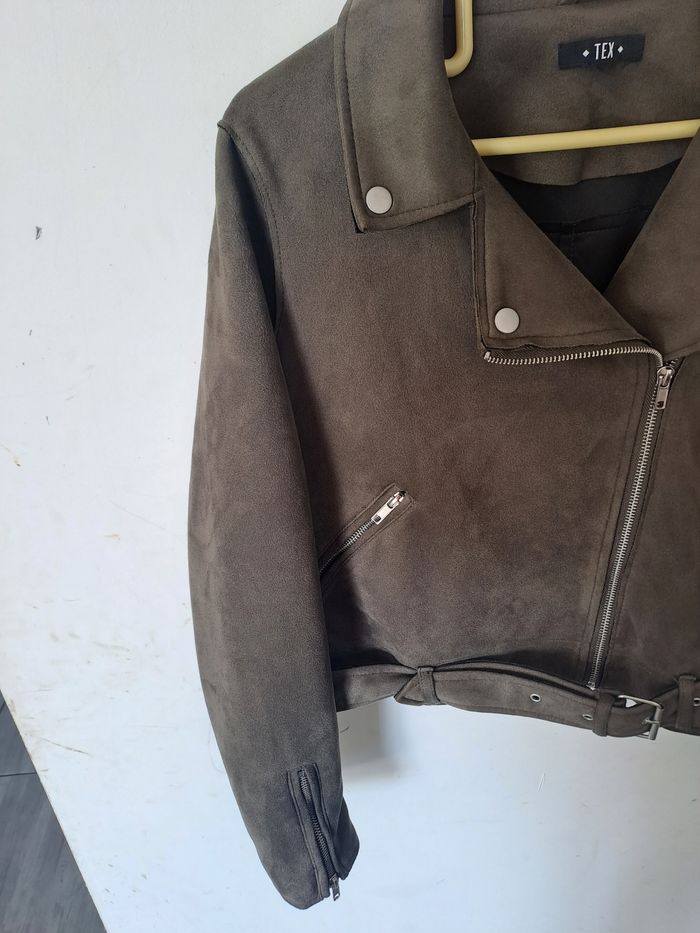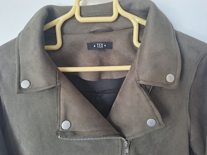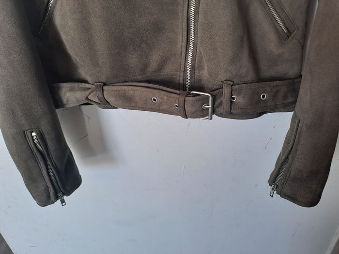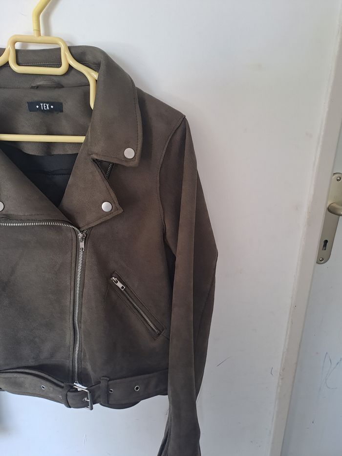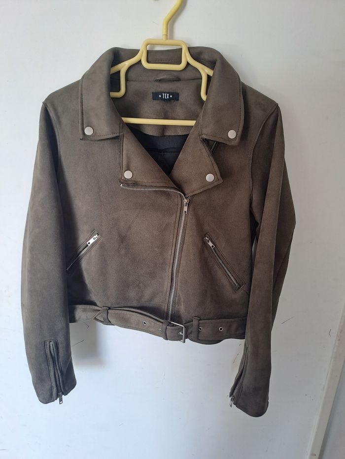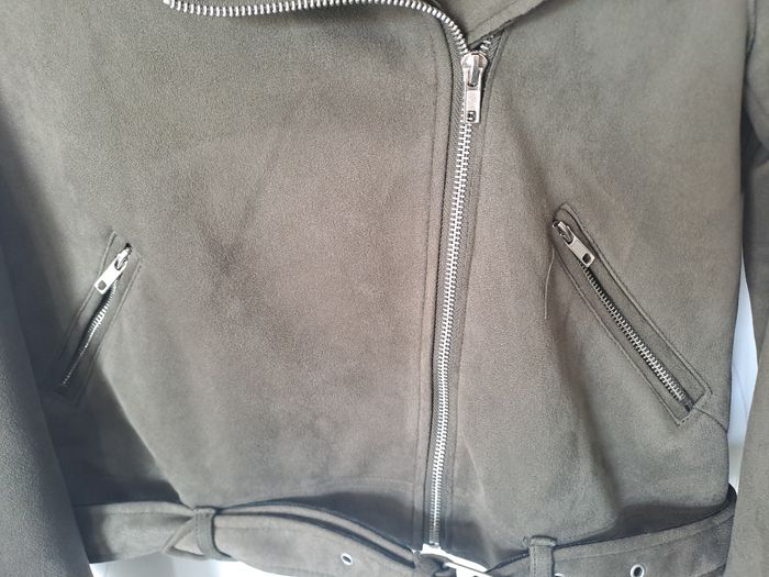Veste style perfecto, biker Matière effet Daim Manches longues avec fermeture éclair Attache avec fermeture éclair et ceinture Couleur Kaki (marron/vert) Pas d'étiquette de taille Marque TEX