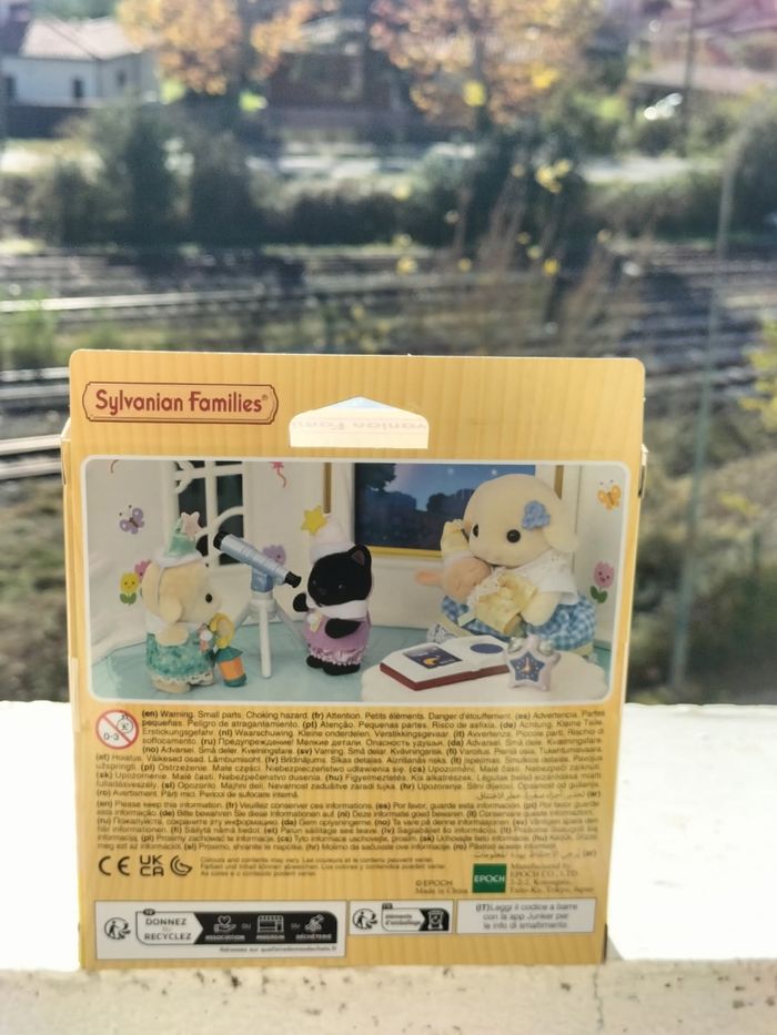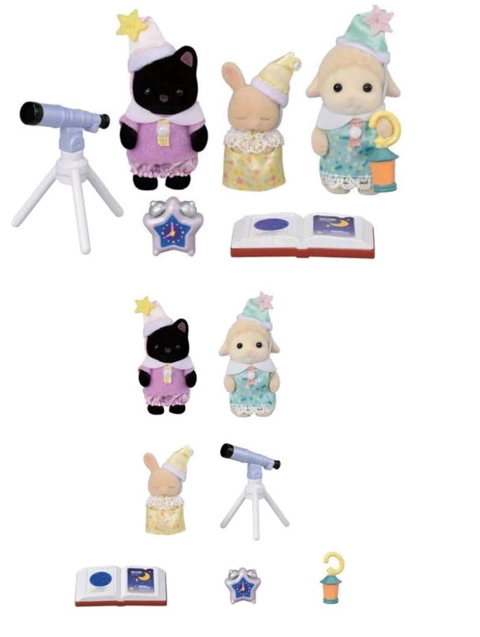 SYLVANIAN FAMILIES 3/9 ANS. . MIXTE- Ce Set fait partie de l'univers de la crèche. - SET 5750 : LE TRIO DES BÉBÉS PYJAMA PARTY. C 'est l'heure d'aller se coucher ! Avant d'aller dormir les bébés Sylvanian organisent une Pyjama Party Les bébés Chat Magicien en pyjama violet, Mouton en pyjama bleu et Lapin Crème aux yeux fermés en pyjama jaune observent les étoiles avec le télescope et le livre d'astrologie. Au moment de dormir, les bébés sont heureux d'avoir le réveil en forme d'étoile et la veilleuse . . Les bébés avec leurs bonnets de nuits regardent les étoiles à travers le télescope avant d'aller à la sieste (ou dormir.si pour maisons Sylvanian..) avec une histoire pour s'endormir. . La lanterne éclaire leur chemin pour rentrer chez-eux. . Le réveil en forme d'étoile, leur indique l'heure . Pour se réveiller, l'heure de la récrée, de l'entrée en classe...les différentes activités de la journée. Le bébé Chat Magicien et le bébé Mouton sont articulés. COFFRET À 18 € Avec ces bébés rêveurs votre enfant va pouvoir s'inventer de belles histoires avec ses figures préférées.