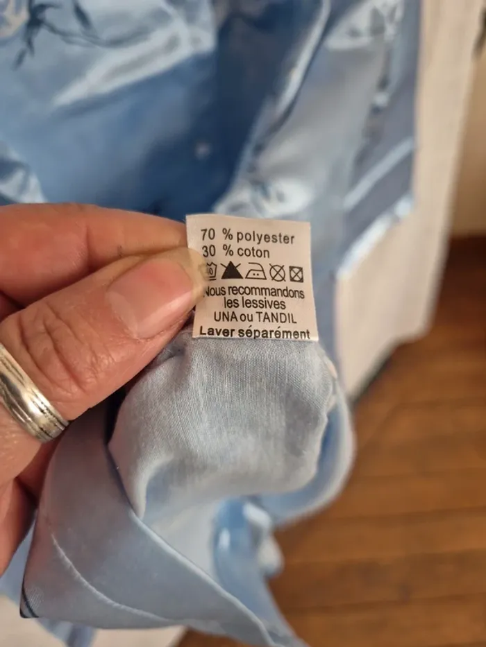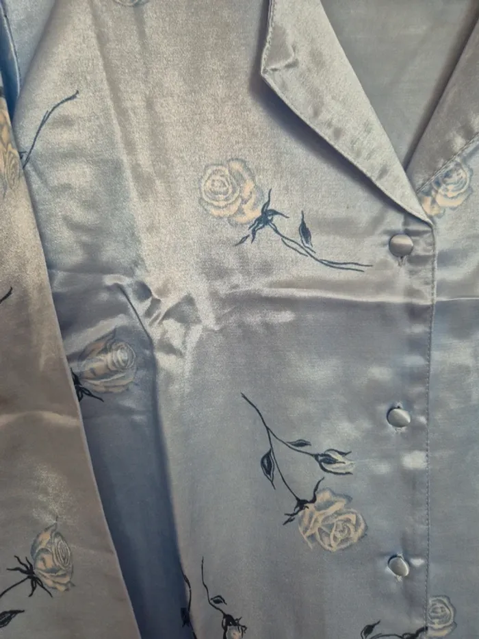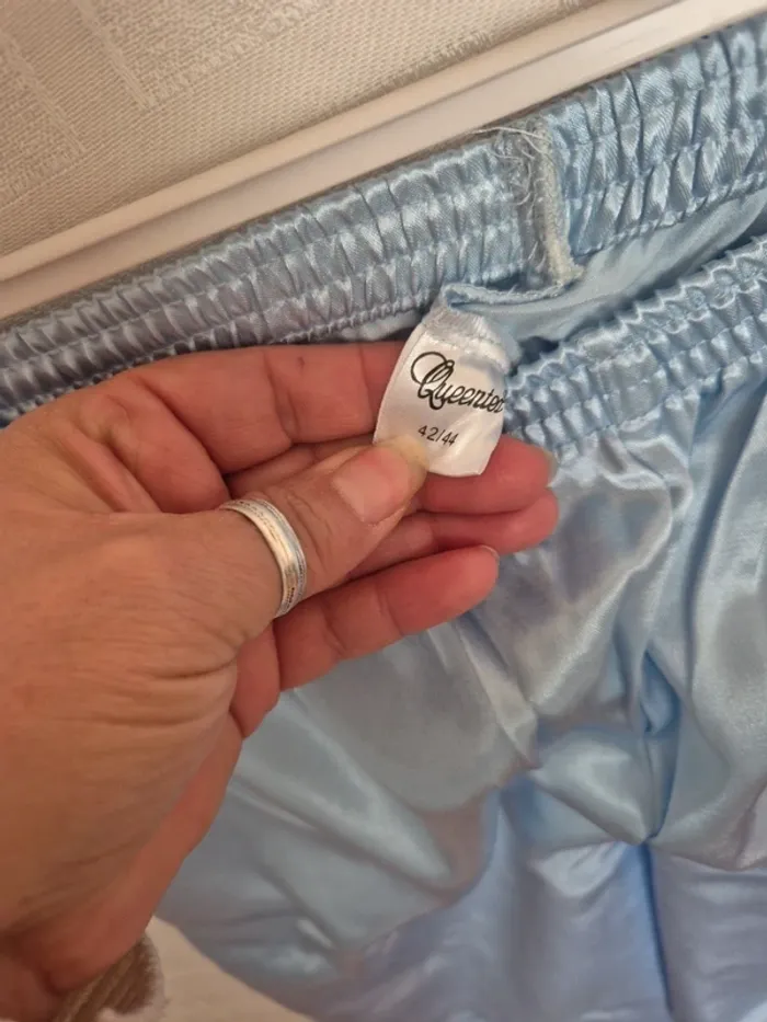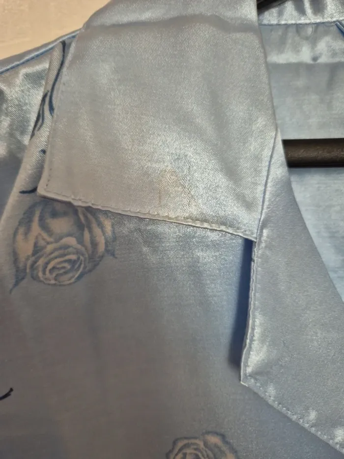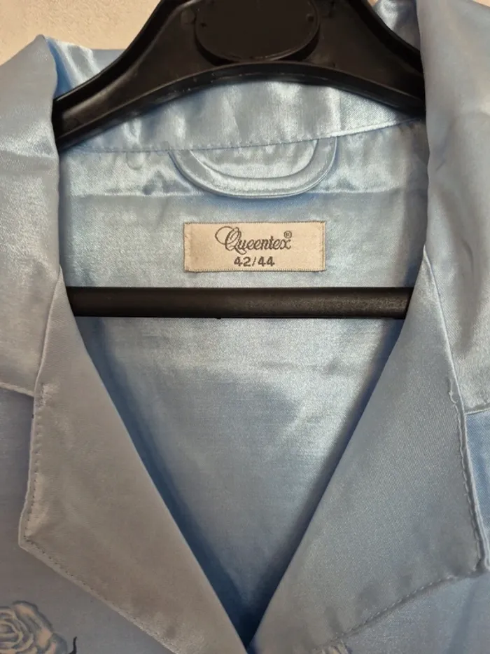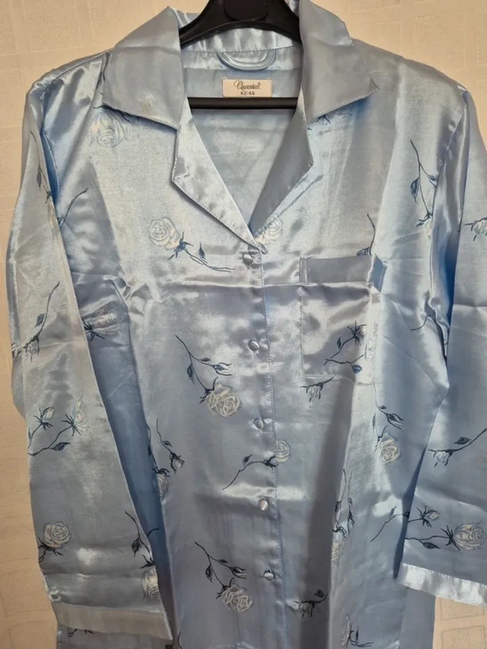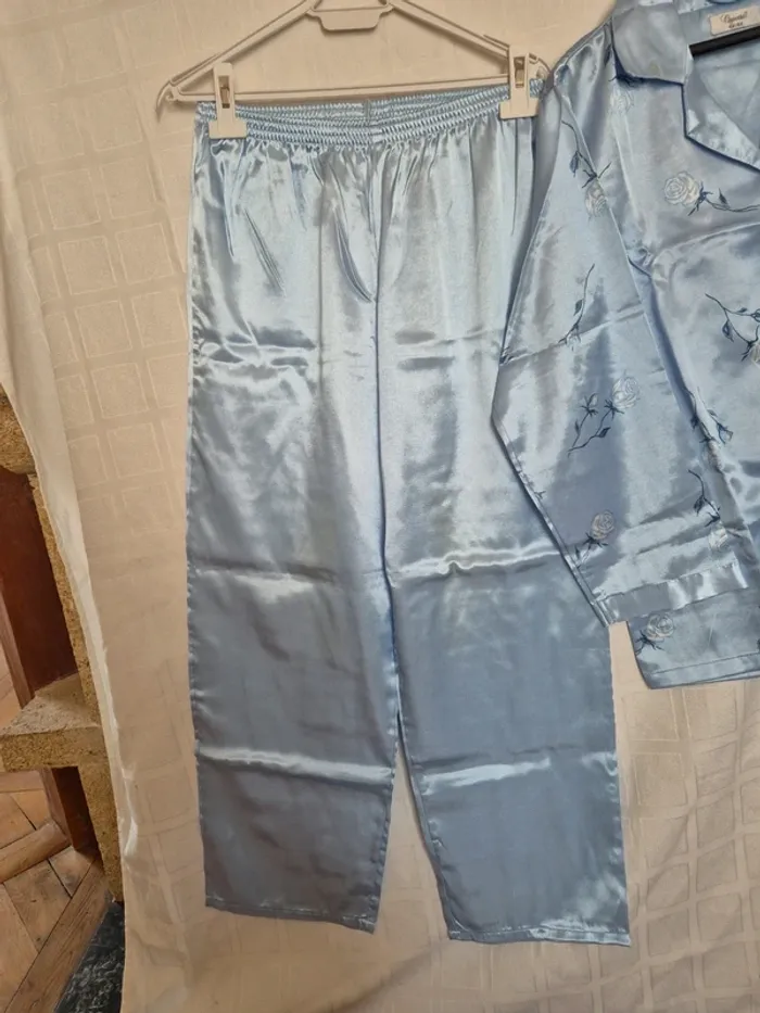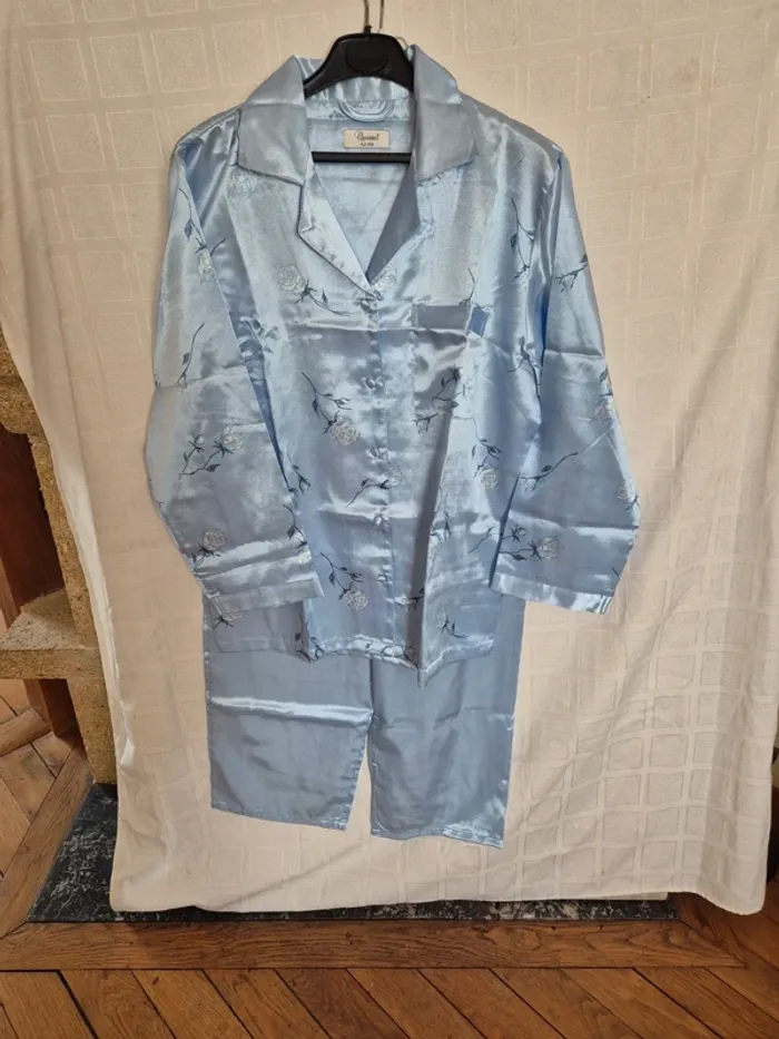 ⬇️mes autres annonces pour femme en taille 42 👉 #cg89femme42 ⬇️mes autres annonces pour femme en taille 44 👉 #cg89femme44 un pyjama en satin de couleur bleu ciel et le haut imprimé de rose. Il mesure 56 cm aux aisselles et 70 cm de longueur, le pantalon mesure 97 cm longueur. il a été très peu porté, il était dans le placard et du coup il a des taches jaunes - voir photo bon état - taille 42 - taille 44 - marque queentex #pyjama #lingerie #tenuedenuit