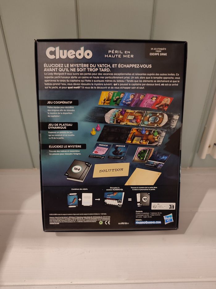 produit neuf Hasbro gaming envoi rapide et soigné Les joueurs ont accepté une invitation pour des vacances tous frais payés à bord du Lady Marigold II, le yacht luxueux du capitaine Melville, qui abrite un casino particulièrement prisé. Un soir, alors que la tempête approche, quelqu'un aperçoit le corps du capitaine qui flotte à quelques mètres du bateau ! Tandis que le bateau prend l'eau, les joueurs sont mis à l'épreuve : ils doivent faire équipe pour s'échapper du yacht et déterminer qui a poussé le capitaine par-dessus bord, où est-ce arrivé sur le yacht, et pour quel motif. Le jeu de plateau Cluedo Péril en haute mer est un jeu d'enquête façon Escape Game qui combine l'intrigue et les personnages du jeu d'enquête Cluedo classique à un jeu de type escape room. Les joueurs déplacent leurs pions sur un plateau de jeu qui se construit et se modifie au fil de la partie, piochant des cartes et révélant des pièces du yacht et des indices dont ils auront besoin pour résoudre les énigmes. Après s'être échappés, les joueurs examinent les indices pour porter leur accusation et gagner la partie ! Ce jeu de plateau amusant pour la famille est conçu pour 1 à 6 joueurs (à partir de 10 ans et est un super cadeau pour les fans de mystère.