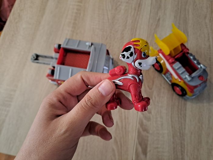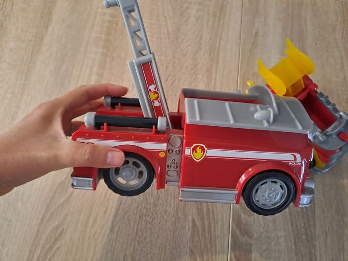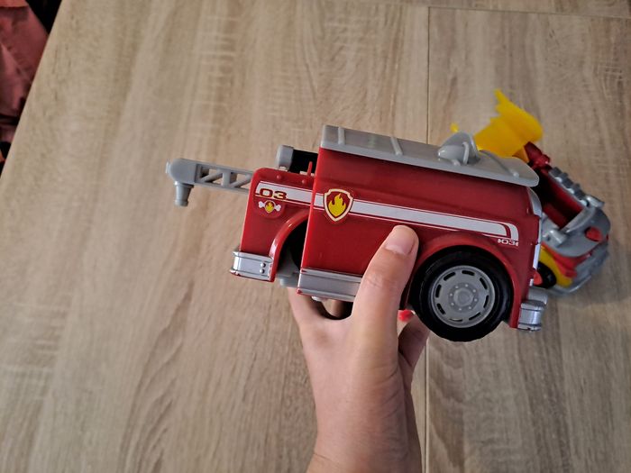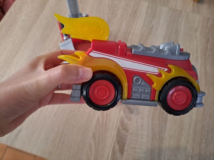 Un camion super patrouille environ 15 cm, il fait du bruit il faut changer les piles, un camion retractable environ 20 cm pompier Marcus et une figurine Marcus. Encore en bonne état, quelques traces de coup mais léger.
