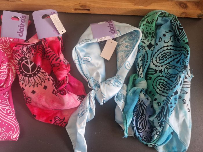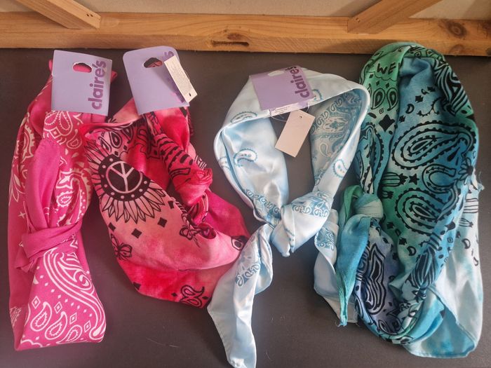 Lot de 4 bandanas neufs deux bleus turquoise et deux roses neufs .