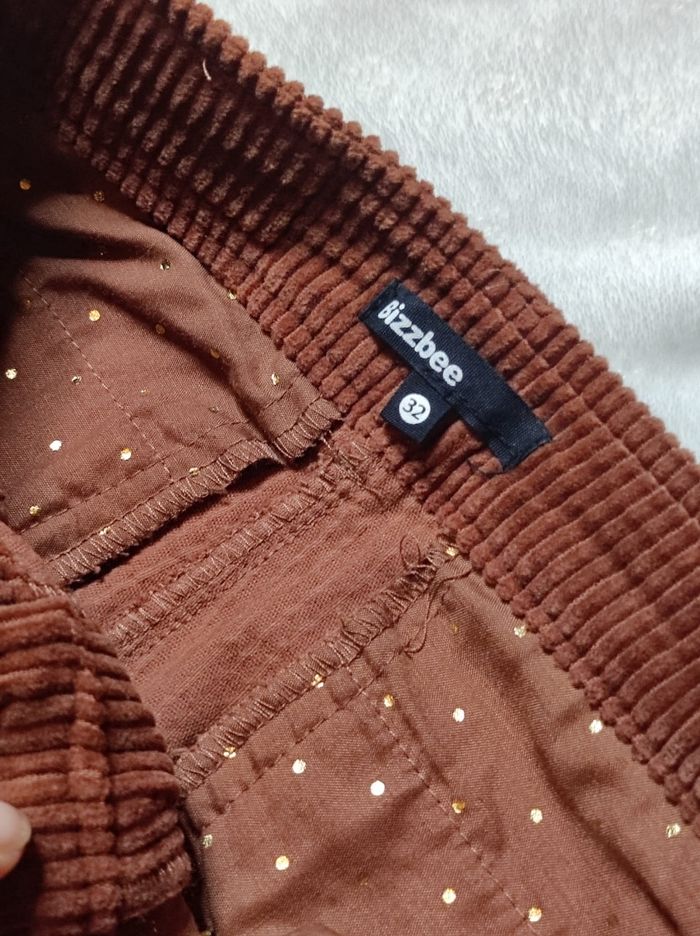pantalon type velours côtelé couleur marron / camel. mi large avec taille haute et poches. 100% coton et poches en 80% polyester et 20% coton. Fermeture éclair et bouton. Peu porter en très bon état. Marque bizzbee en taille XXS / 32.