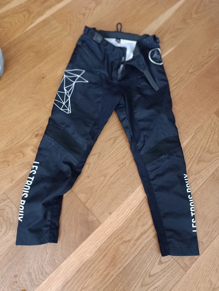 Pantalon bmx 10 ans, renforcement intérieur et possibilité de régler la taille. Marque française. Vendu neuf 100€. Éraflure au genou mais aucun trou ou tache. Très résistant