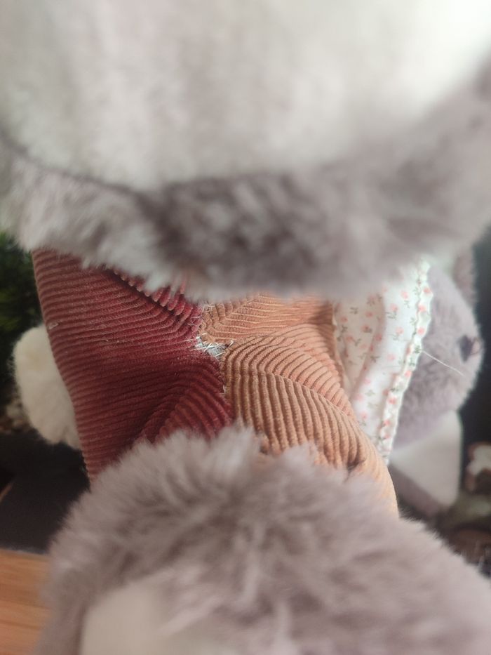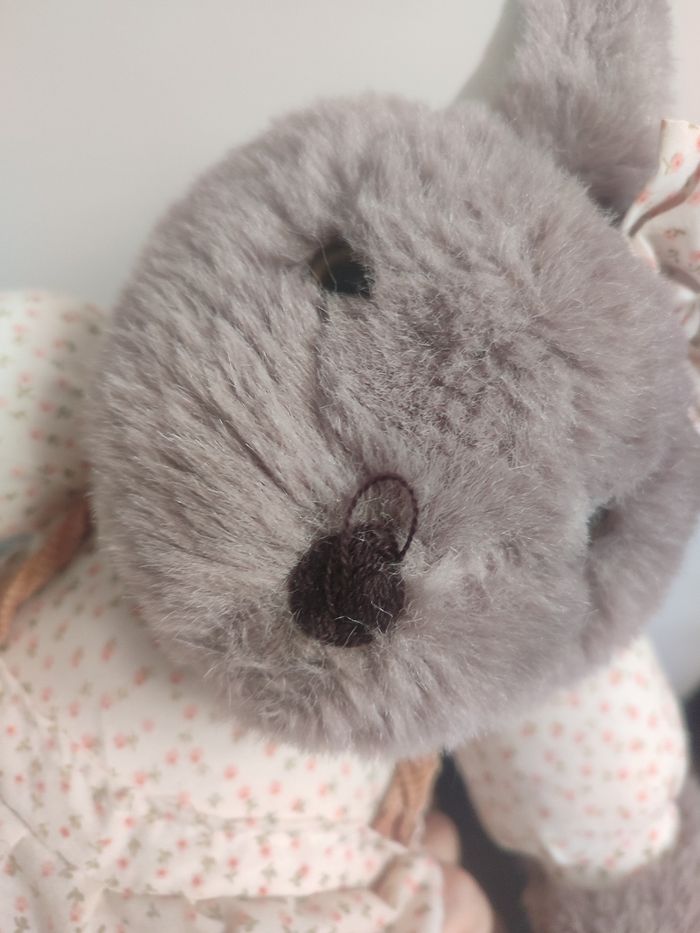 Grande Peluche lapin gris marron tablier salopette fleur blanc jemini Noeud - photo numéro 5
