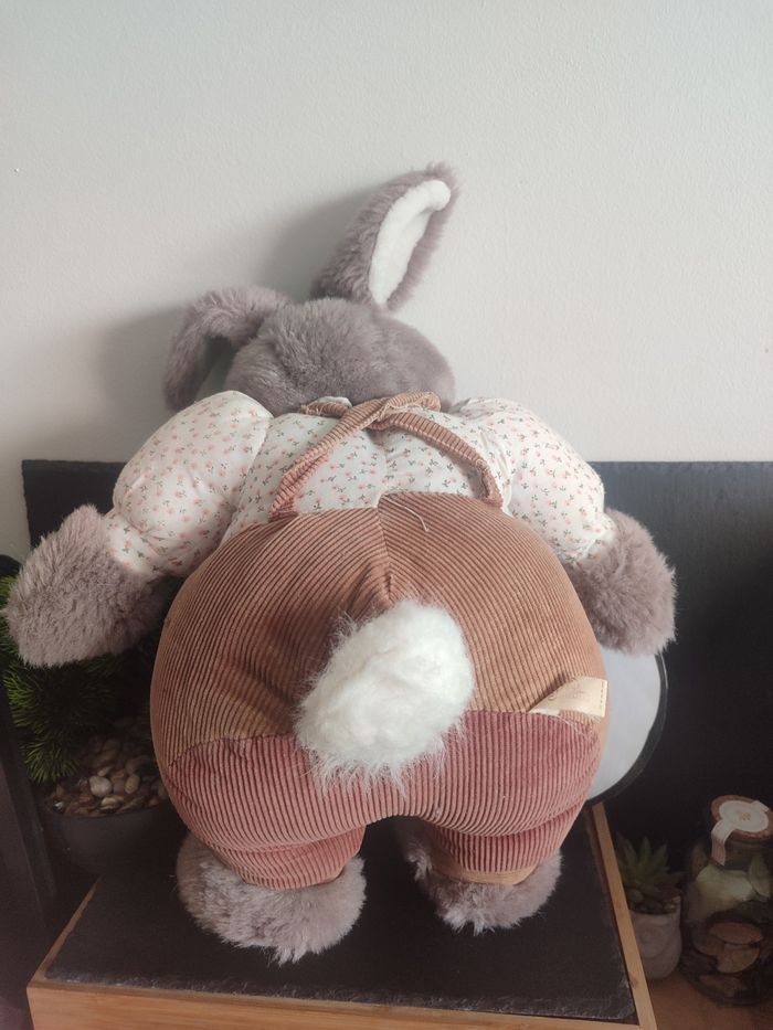 Grande Peluche lapin gris marron tablier salopette fleur blanc jemini Noeud - photo numéro 4