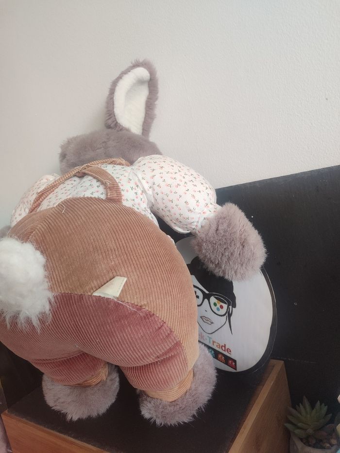 Grande Peluche lapin gris marron tablier salopette fleur blanc jemini Noeud - photo numéro 3