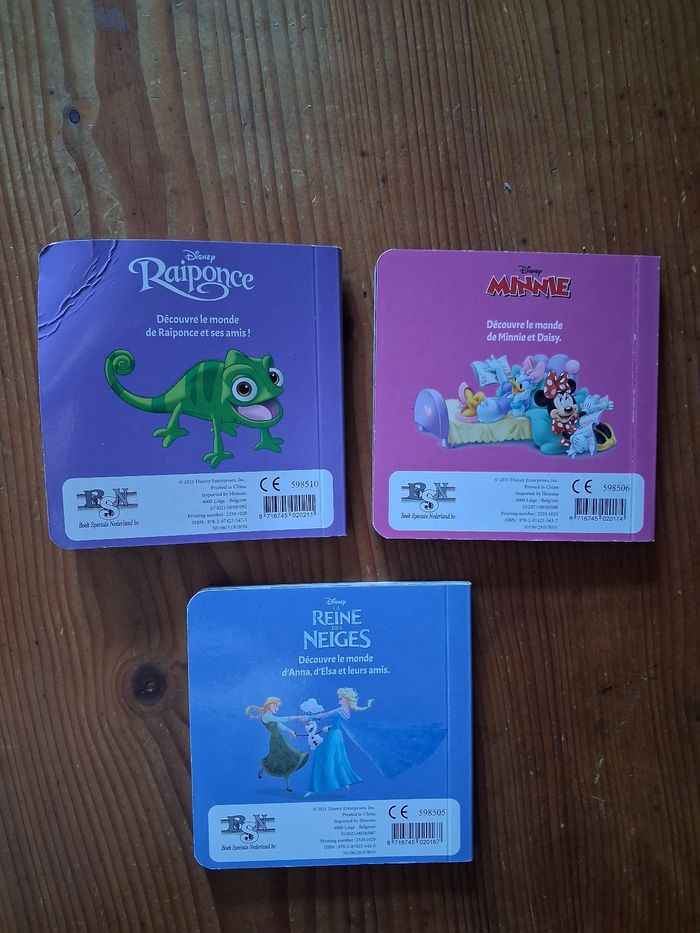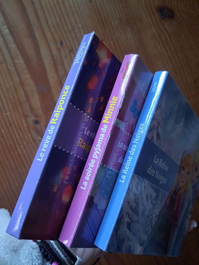 Lot de 3 Petit livre Disney : - Le rêve de Raiponce - La soirée pyjama de Minnie - La reine des Neiges En bon état pour celui de Minnie et La reine des Neiges mais celui de Raiponce a la dernière page cornée.